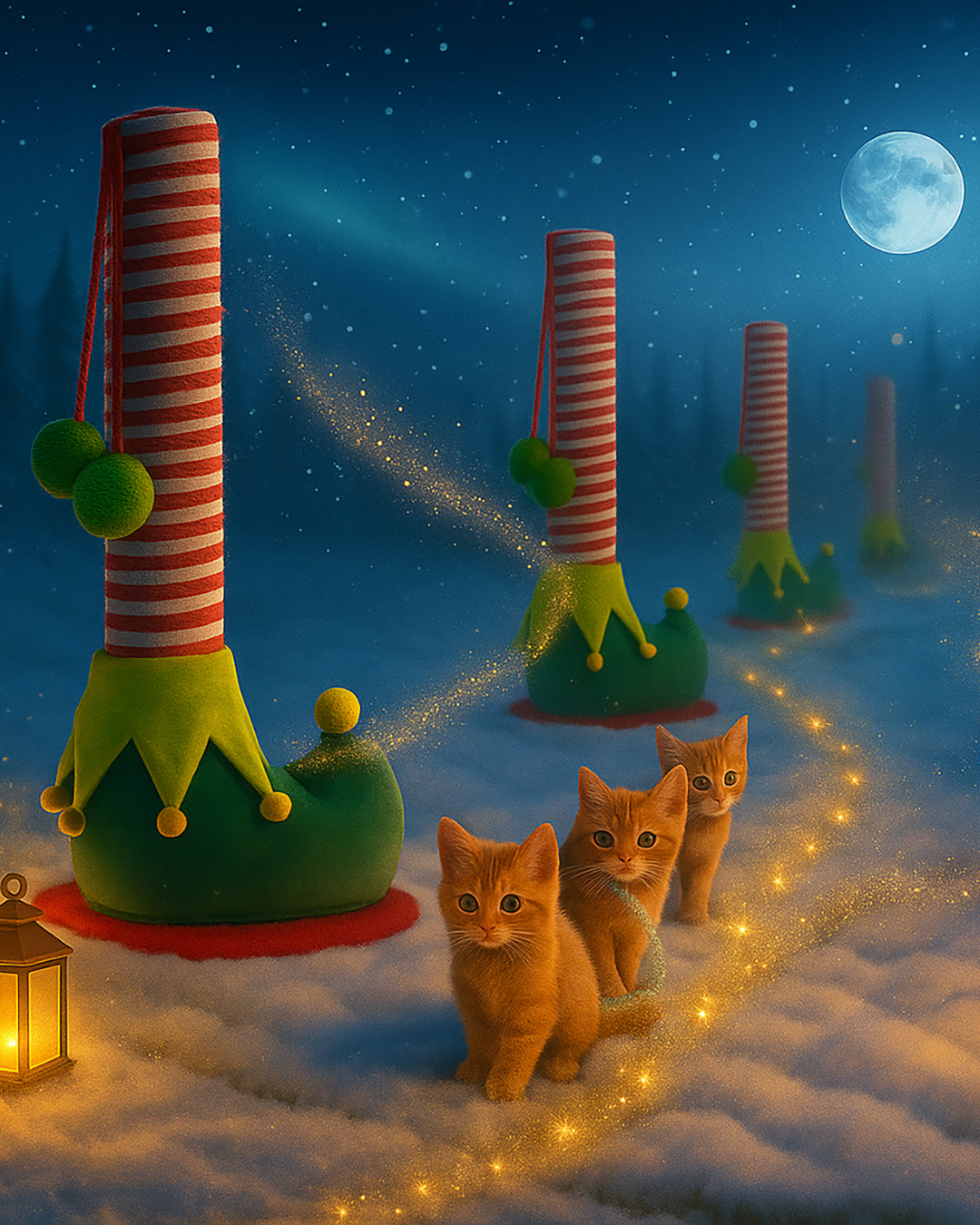 Chestnut heroically sprung from the moving train towards the light in the distance, the meowing growing louder as he neared the twinkling glow. After what felt like an eternity, he entered a clearing lined with large festive elf legs and could just make out three tiny kittens.