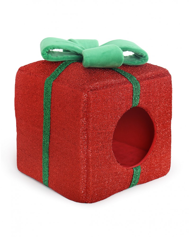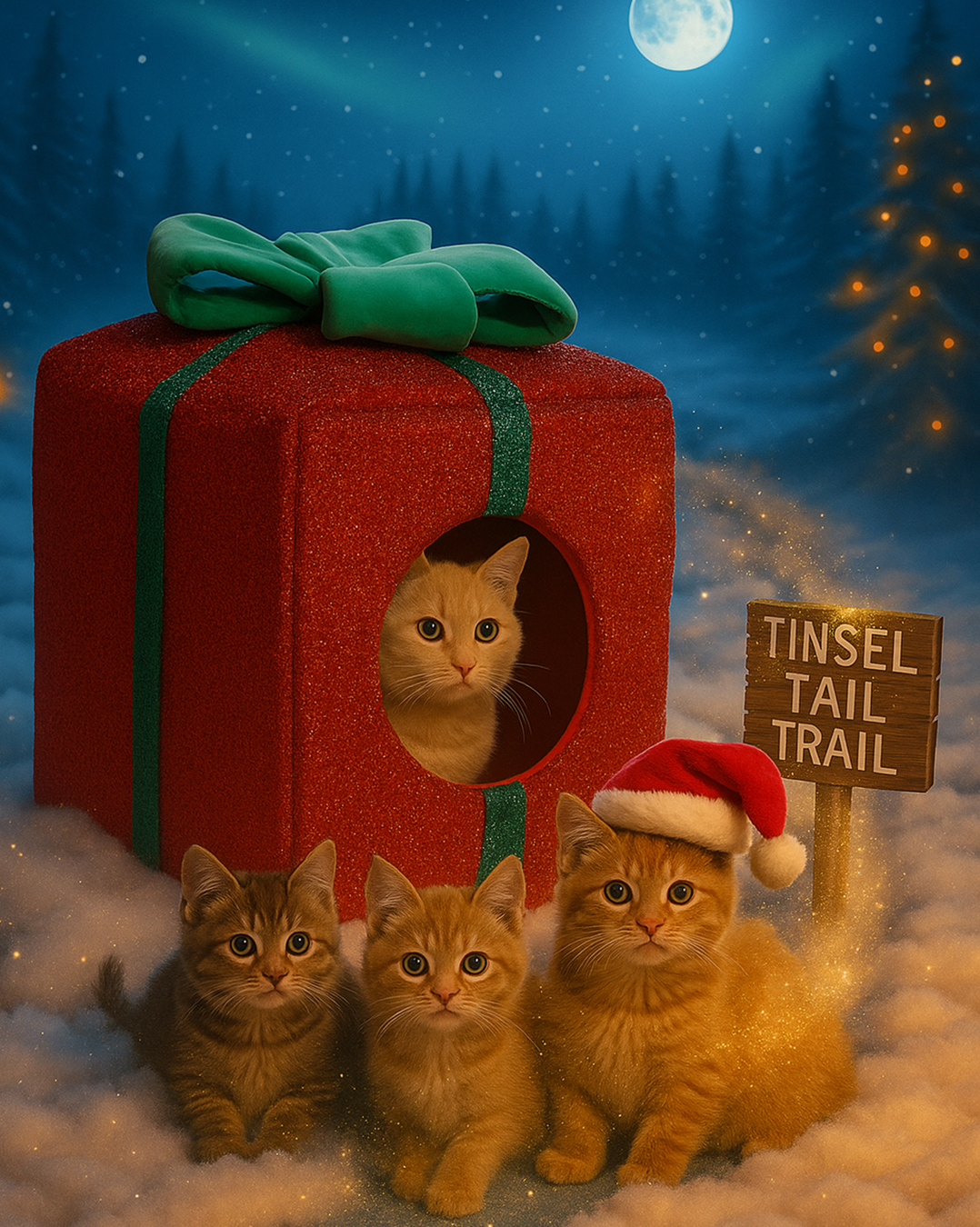 The kitten triplets shifted their trot to a run at the sight of a beautiful red house in the shape of a present. The house looked warm and inviting with its glitter covered sides and festive bow adornment.