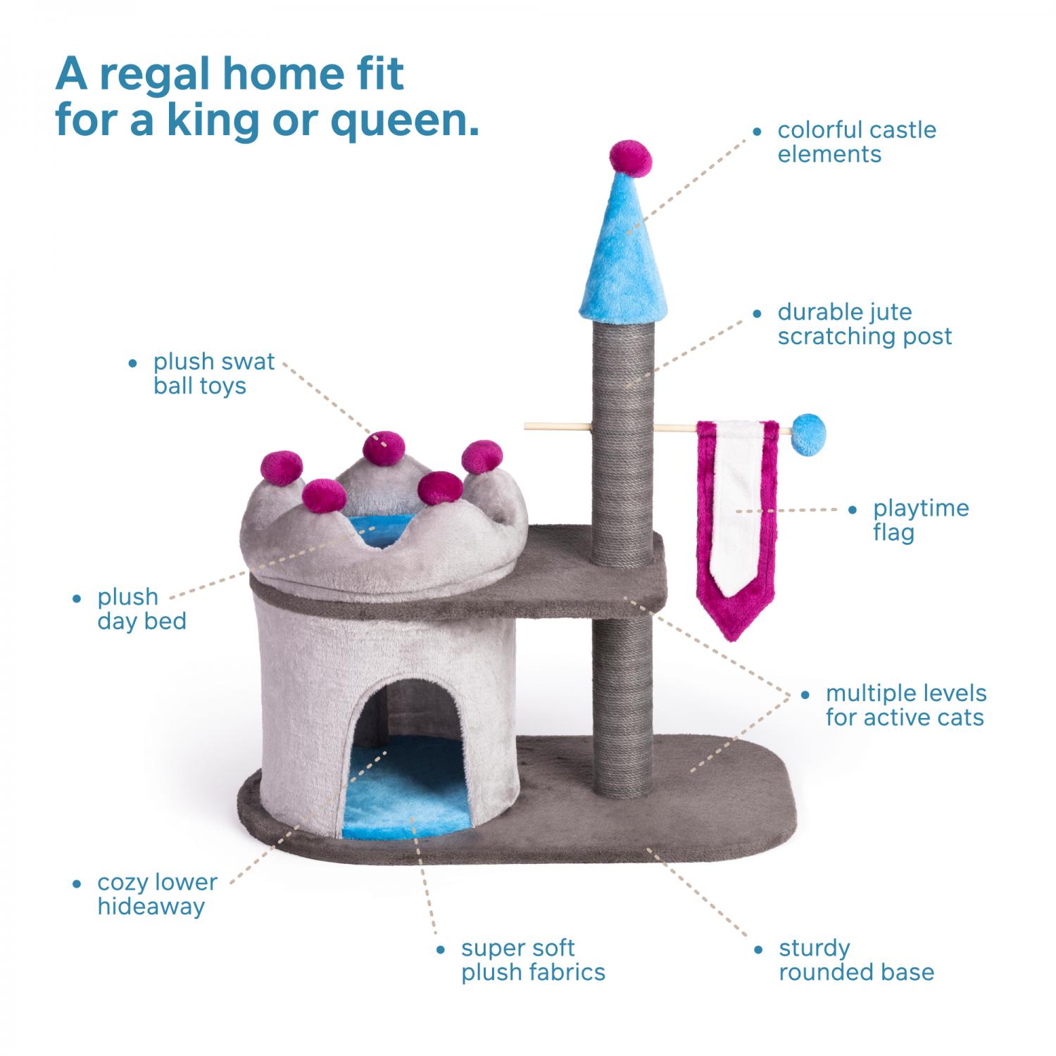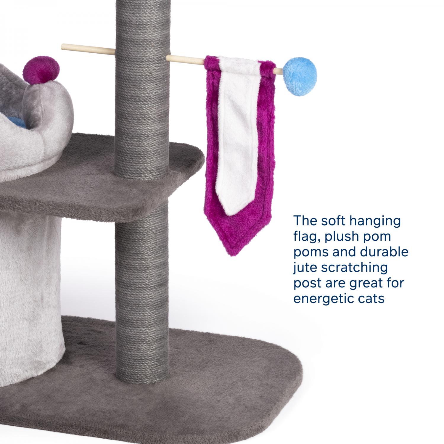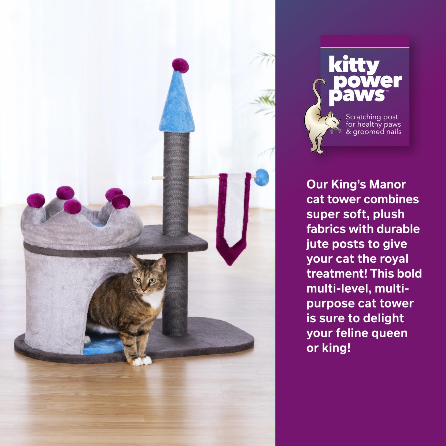 King’s Manor (#7350) from Prevue Pet Products gives your cat the royal treatment! With places to sleep, stretch, hide, and play, this cat tower features a pillowy, elevated day bed, hanging flag and plush pom pom swat toys, a durable jute scratching post, and a cozy, lower-level hideaway. This plush cat tower encourages exercise as your cat scratches, grooms nails, and strengthens their paws. With colorful, super soft fabrics, this whimsical multi-level King’s Manor adds a regal presence to any room! Dimensions: 28-3/4"L x 16"W x 34-1/2"H.