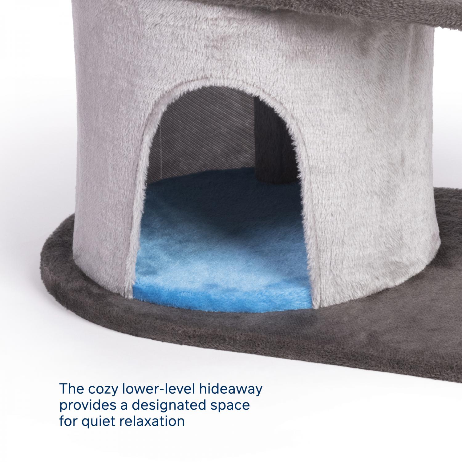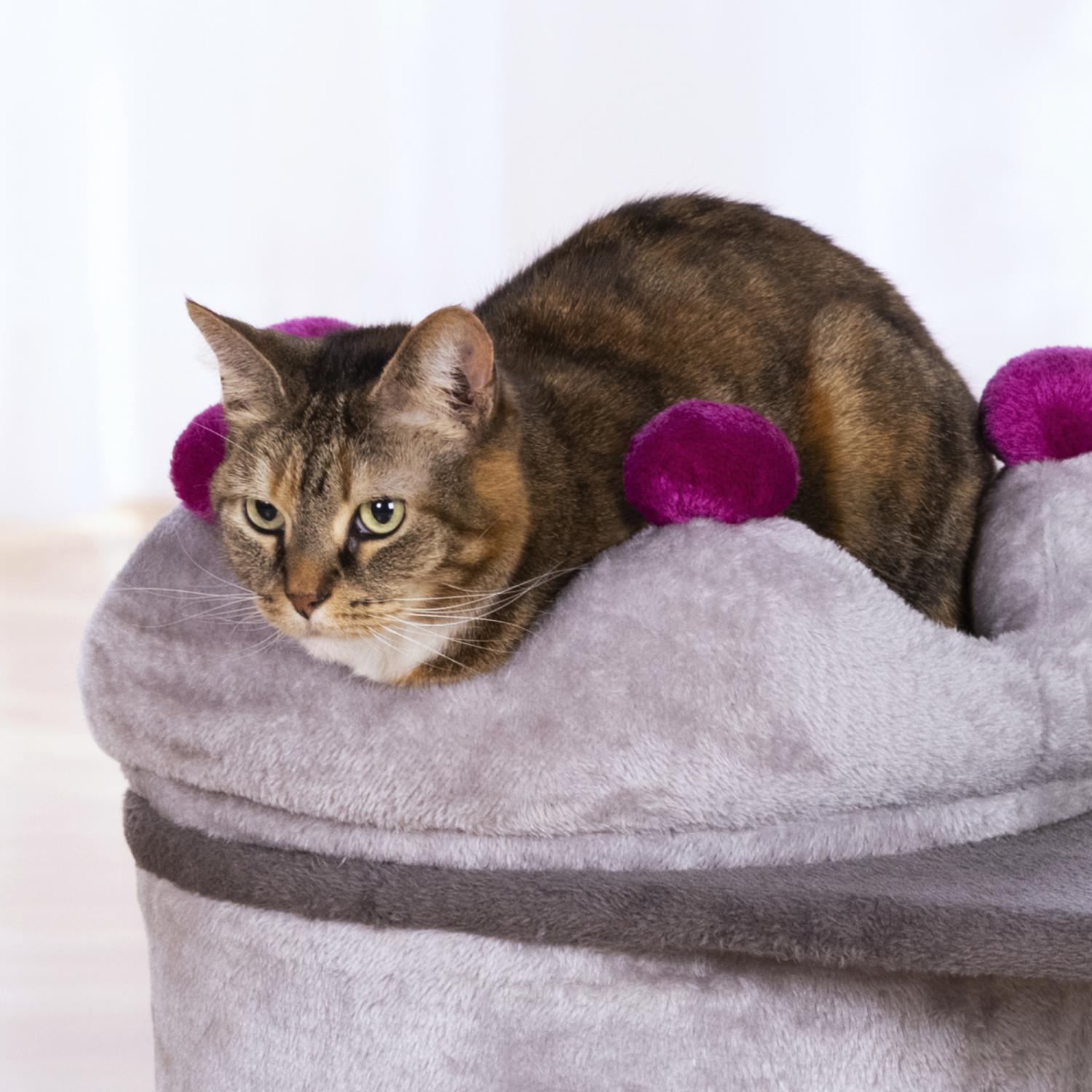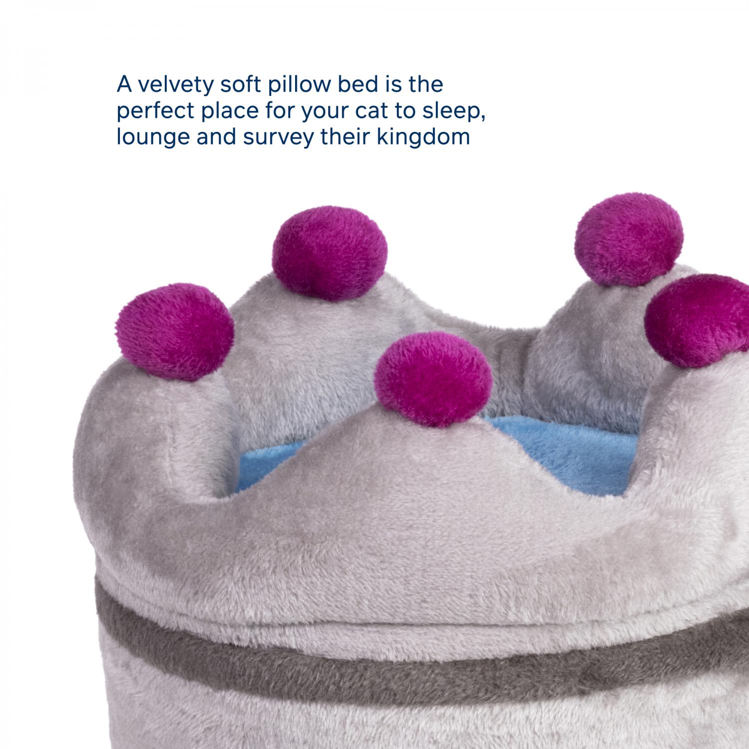 King’s Manor (#7350) from Prevue Pet Products gives your cat the royal treatment! With places to sleep, stretch, hide, and play, this cat tower features a pillowy, elevated day bed, hanging flag and plush pom pom swat toys, a durable jute scratching post, and a cozy, lower-level hideaway. This plush cat tower encourages exercise as your cat scratches, grooms nails, and strengthens their paws. With colorful, super soft fabrics, this whimsical multi-level King’s Manor adds a regal presence to any room! Dimensions: 28-3/4"L x 16"W x 34-1/2"H.