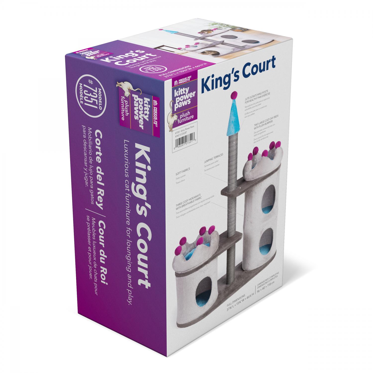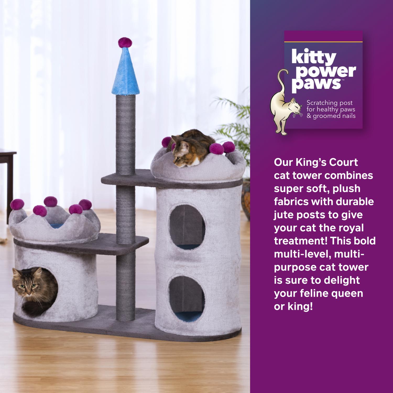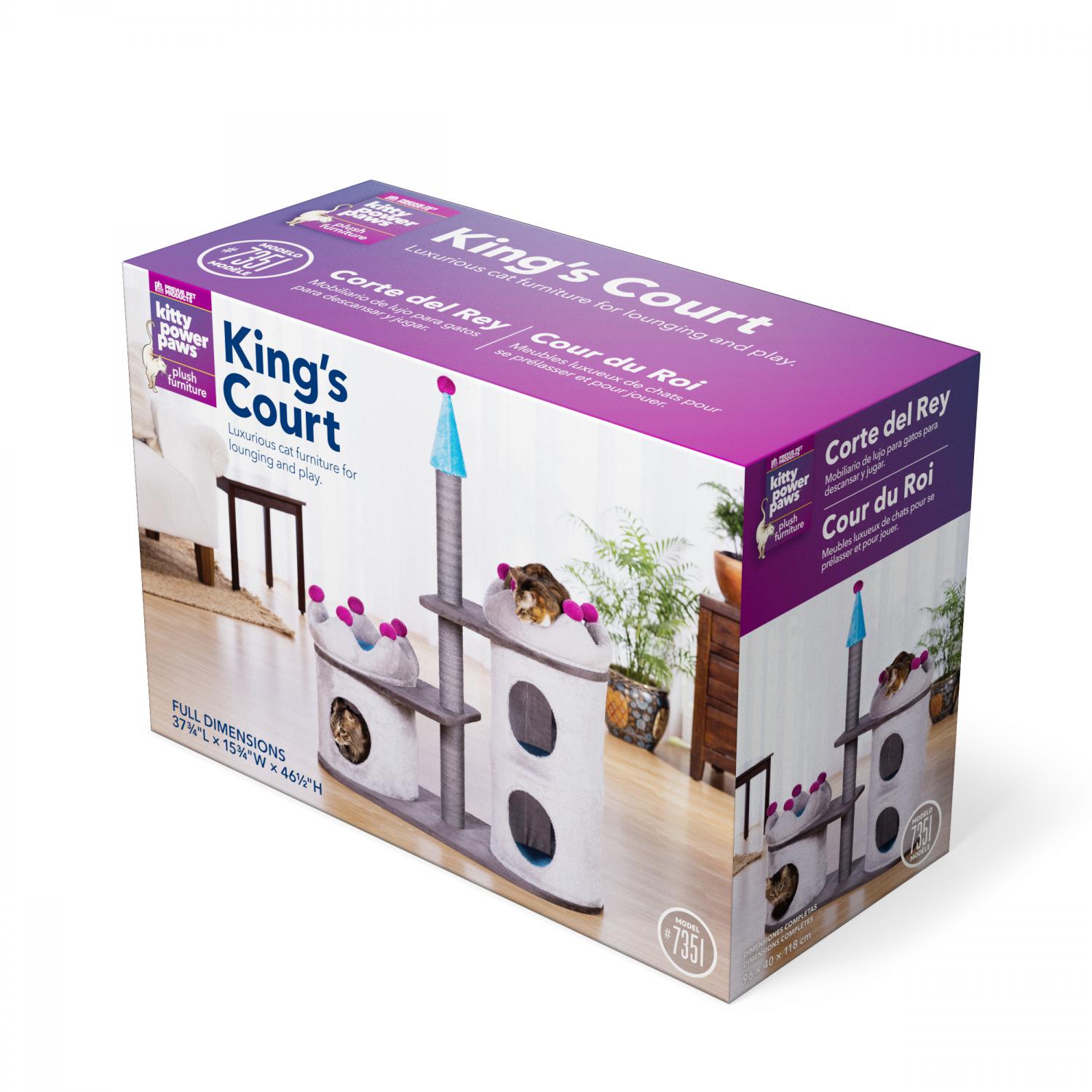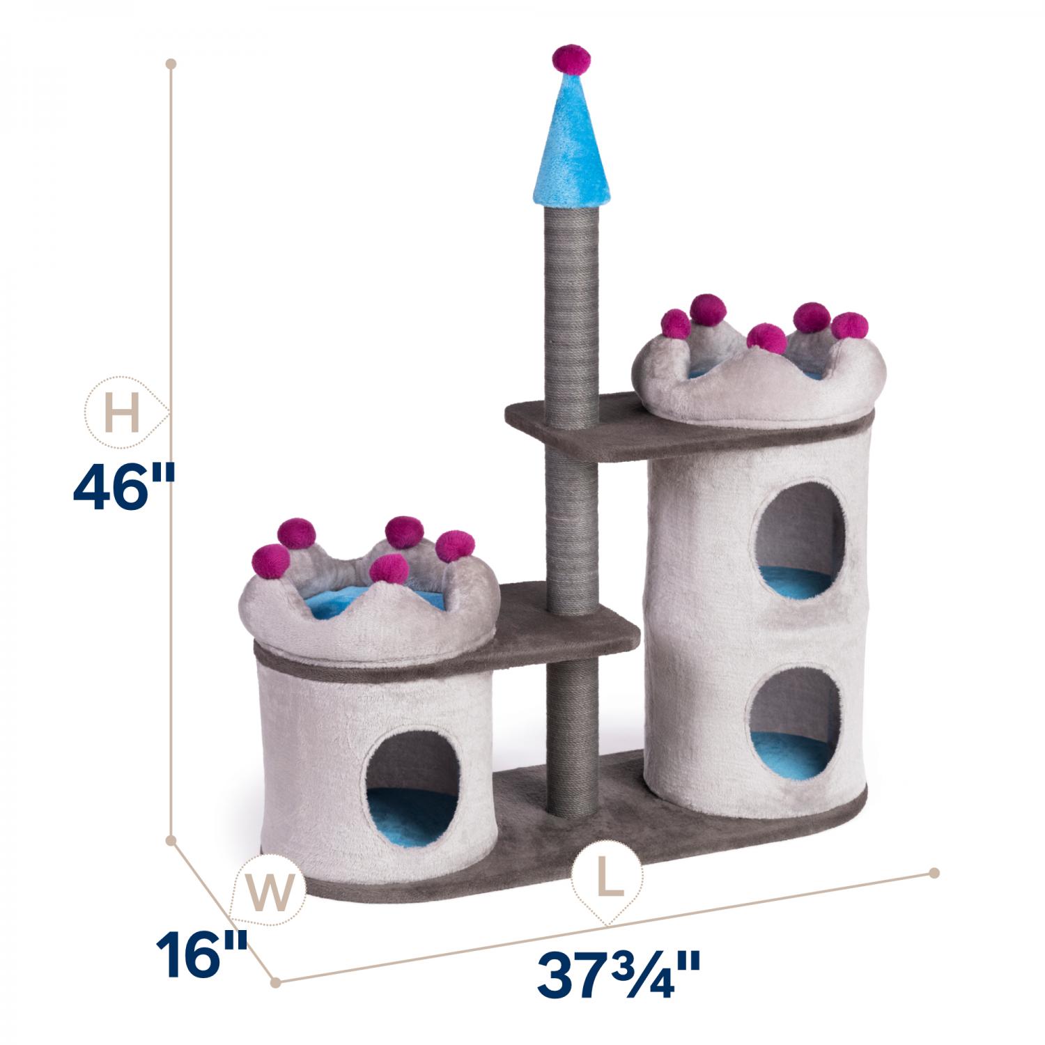 King’s Court (#7351) from Prevue Pet Products gives your cat the royal treatment! With places to sleep, stretch, hide, and play, this cat tower features two pillowy, elevated day beds, plush pom pom swat toys, durable jute scratching posts, and three cozy, multi-level hideaways—perfect for multiple cats. This plush tower encourages exercise as your cat scratches, grooms nails, and strengthens their paws. With colorful, super soft fabrics, this whimsical multi-level King’s Court adds a regal presence to any room! Dimensions: 37-3/4"L x 16"W x 46"H.