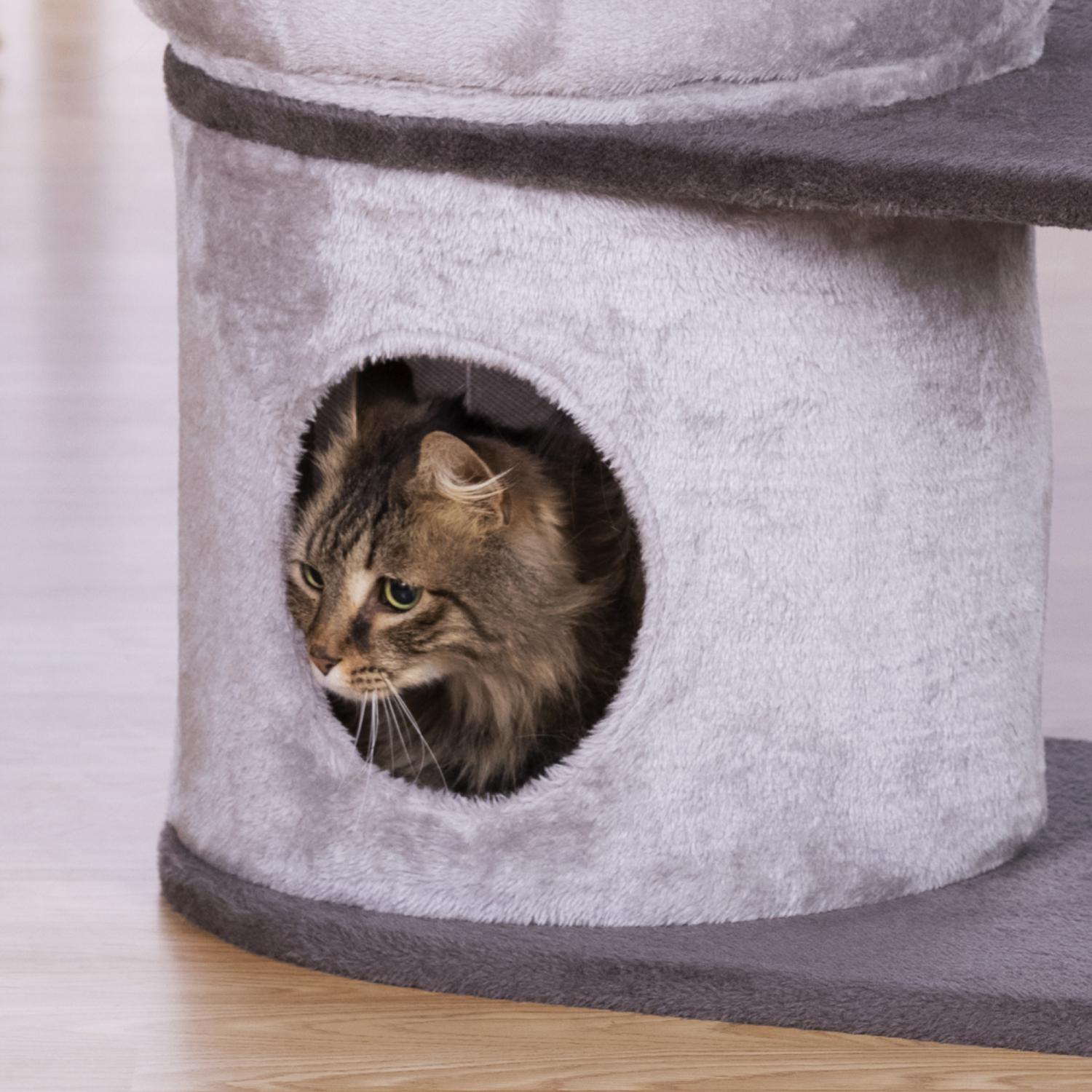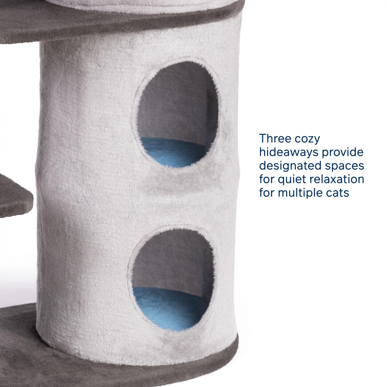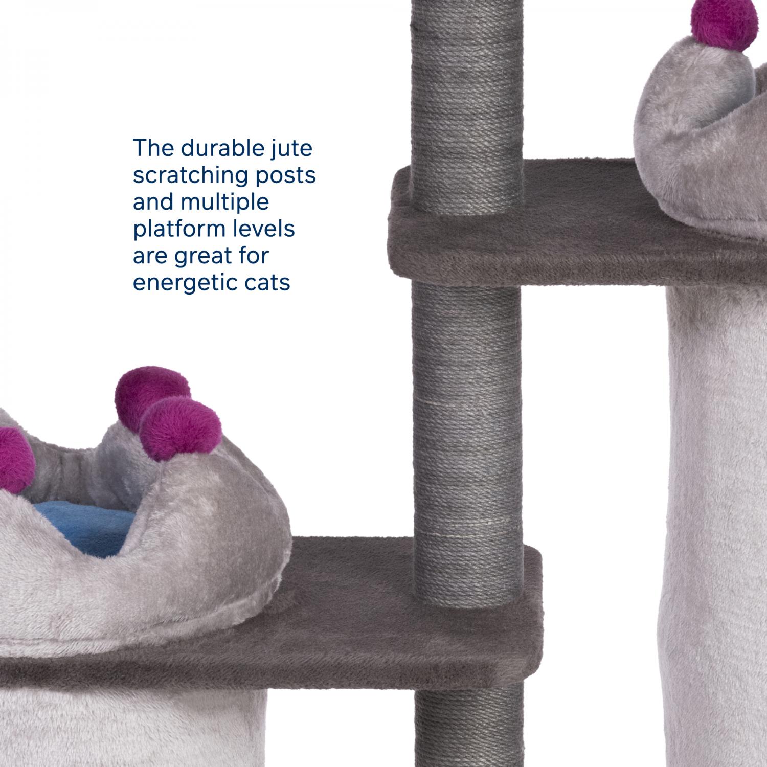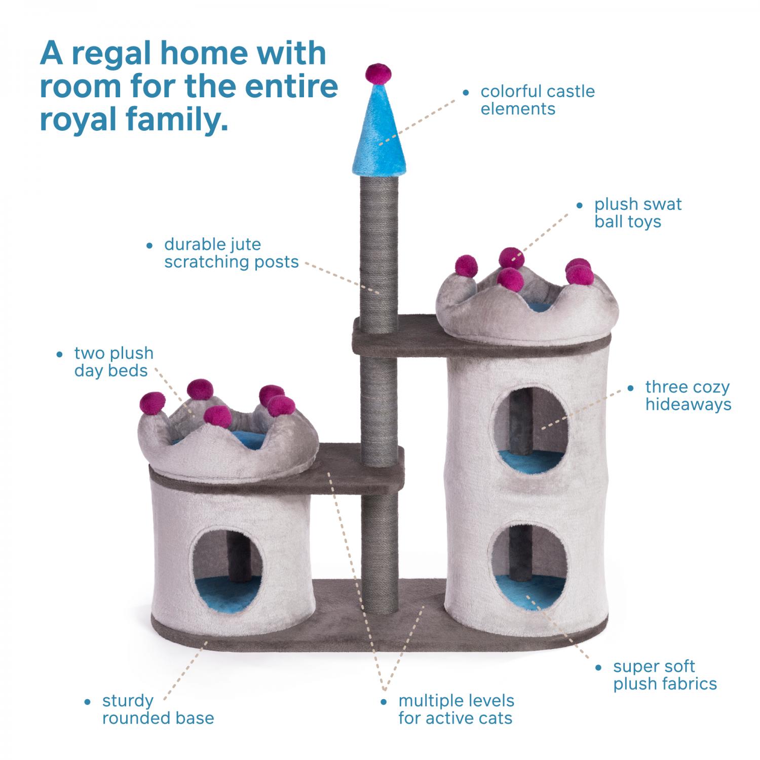 King’s Court (#7351) from Prevue Pet Products gives your cat the royal treatment! With places to sleep, stretch, hide, and play, this cat tower features two pillowy, elevated day beds, plush pom pom swat toys, durable jute scratching posts, and three cozy, multi-level hideaways—perfect for multiple cats. This plush tower encourages exercise as your cat scratches, grooms nails, and strengthens their paws. With colorful, super soft fabrics, this whimsical multi-level King’s Court adds a regal presence to any room! Dimensions: 37-3/4"L x 16"W x 46"H.