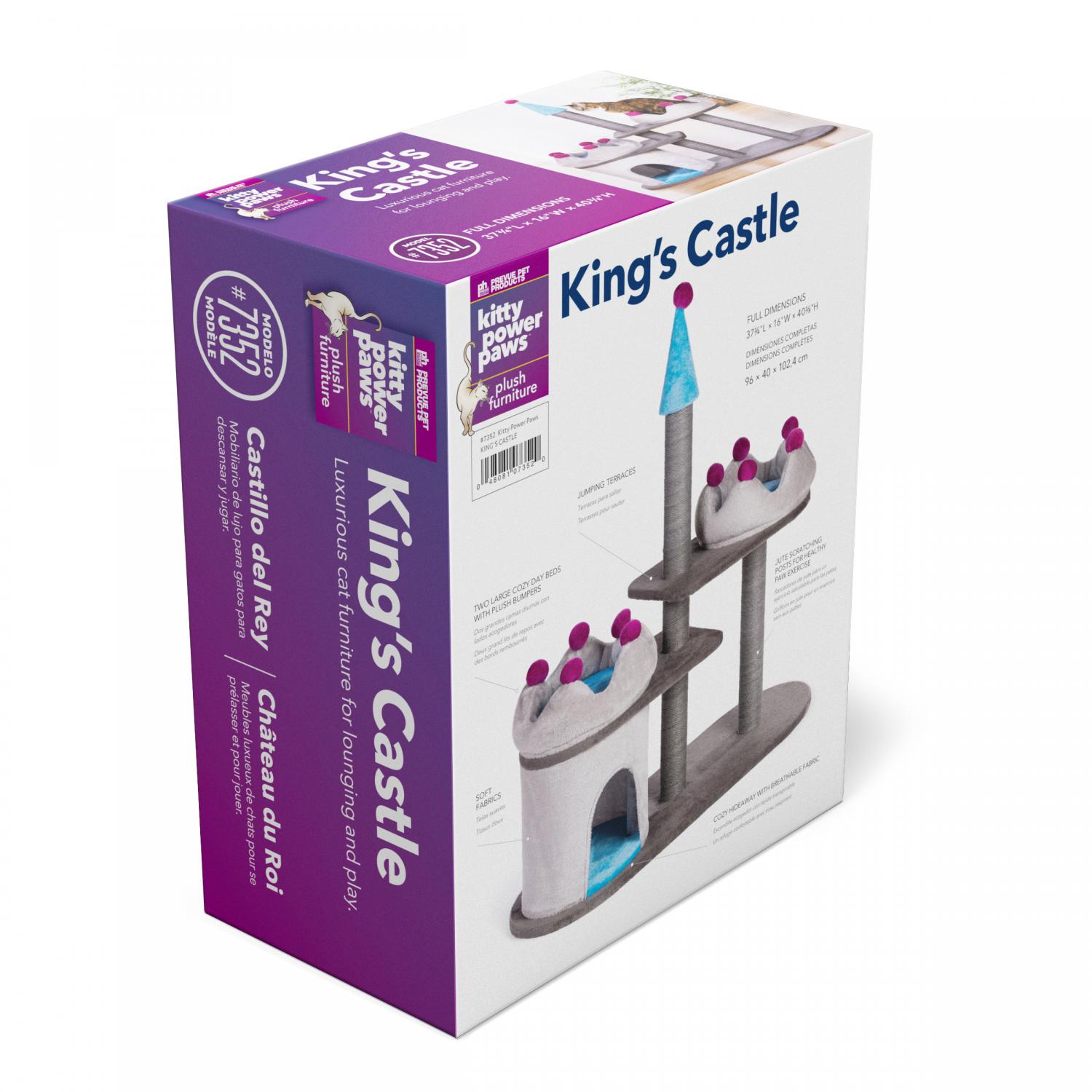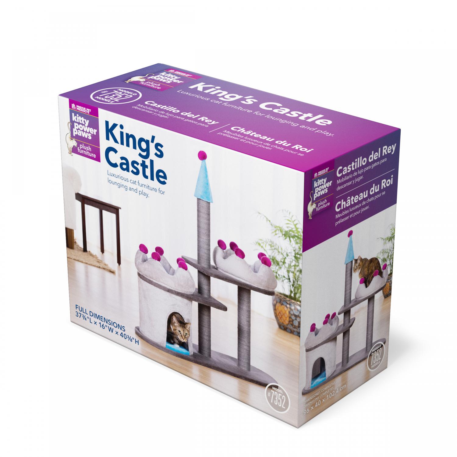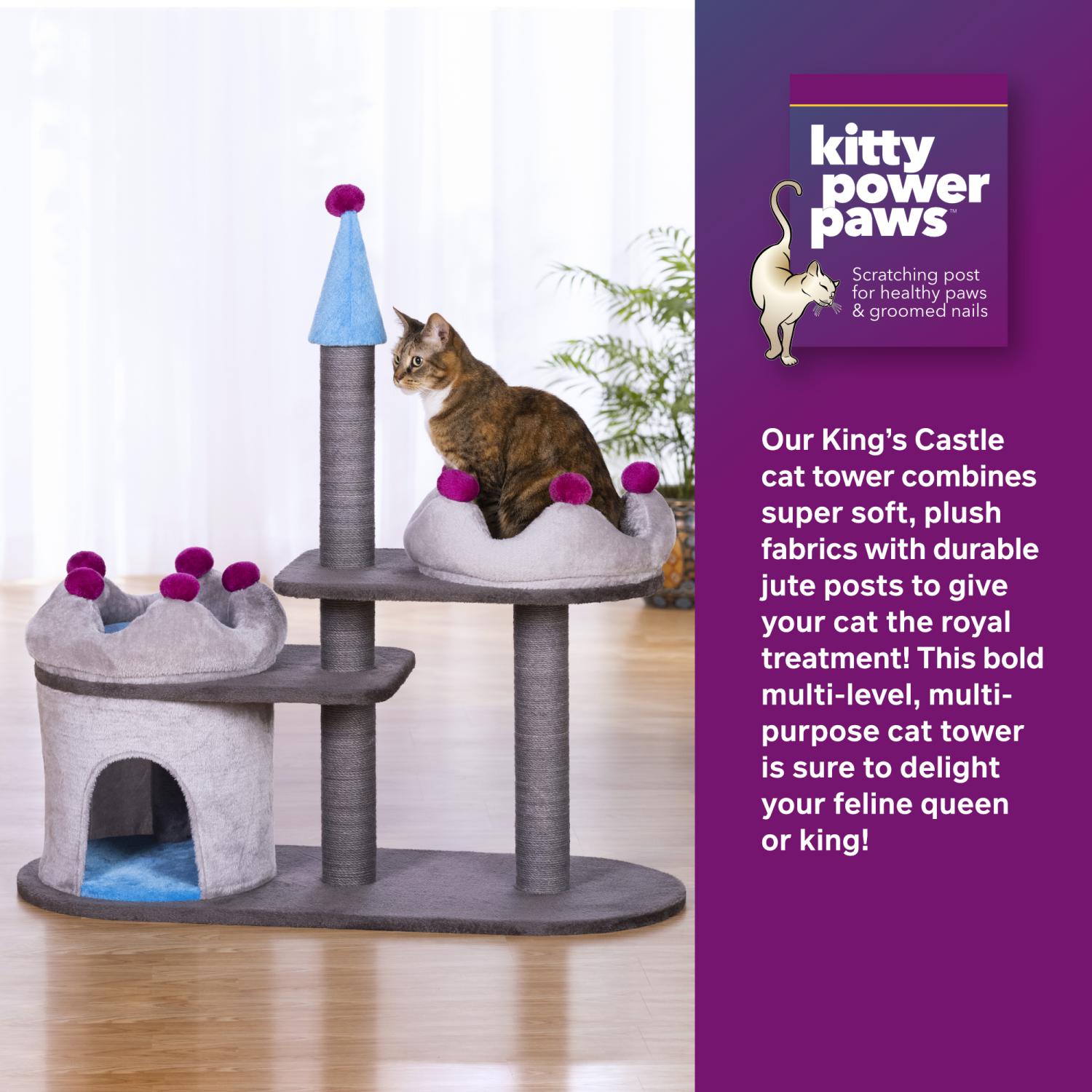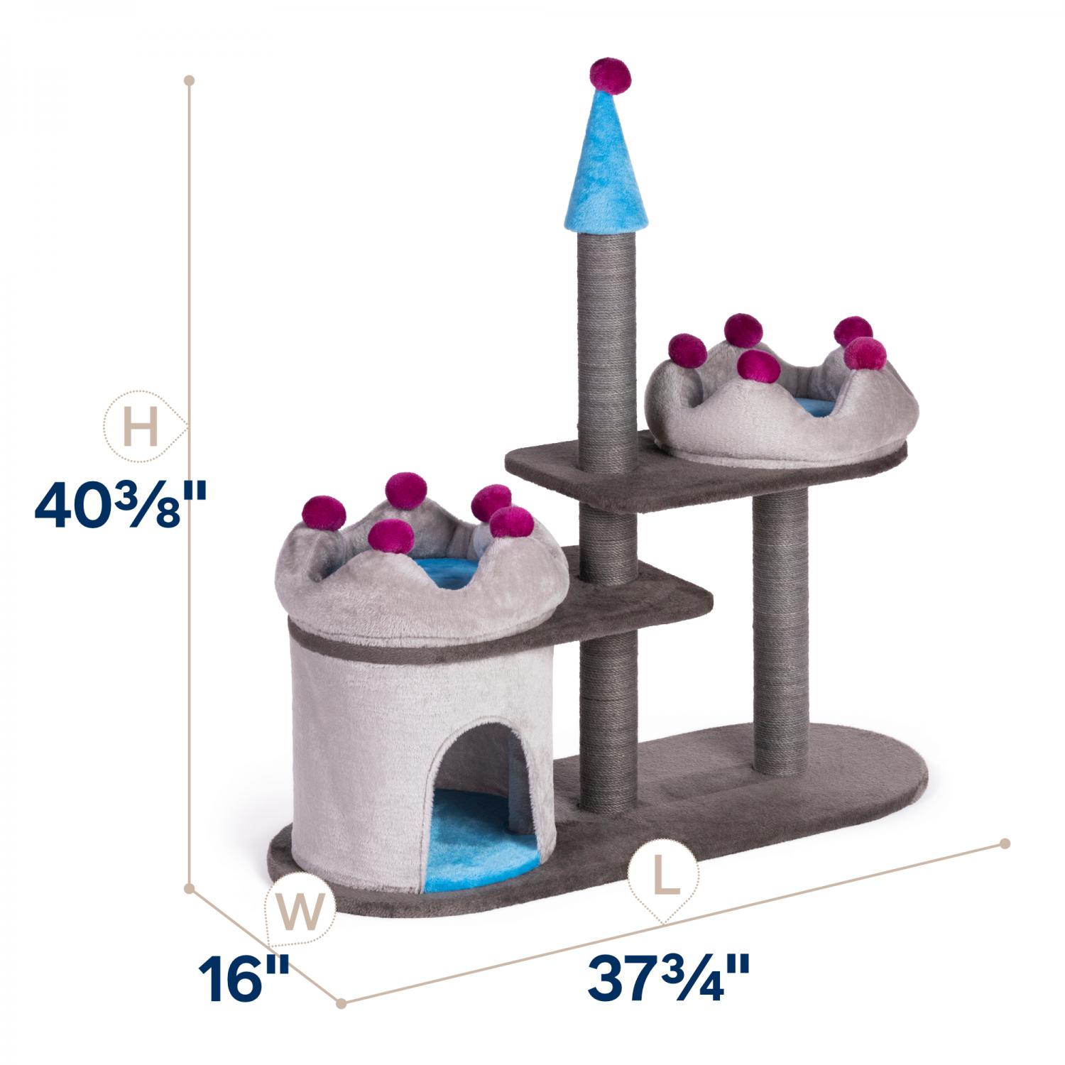 King’s Castle (#7352) from Prevue Pet Products gives your cat the royal treatment! With places to sleep, stretch, hide, and play, this cat tower features two pillowy, elevated day beds, plush pom pom swat toys, a durable jute scratching post, and a cozy, lower-level hideaway. This plush cat tower encourages exercise as your cat scratches, grooms nails, and strengthens their paws. With colorful, super soft fabrics, this whimsical multi-level King’s Castle adds a regal presence to any room! Dimensions: 37-3/4"L x 16"W x 40-3/8"H.