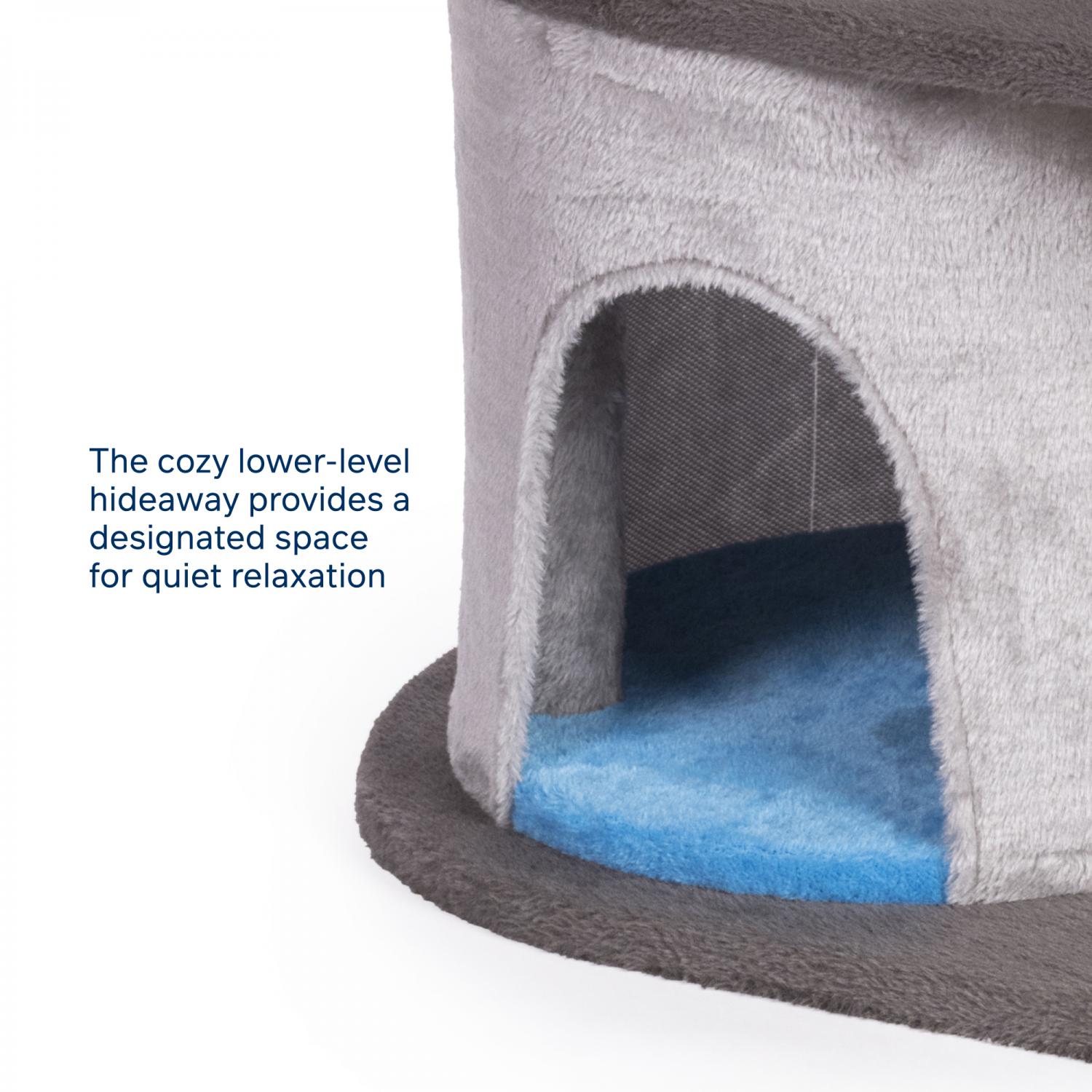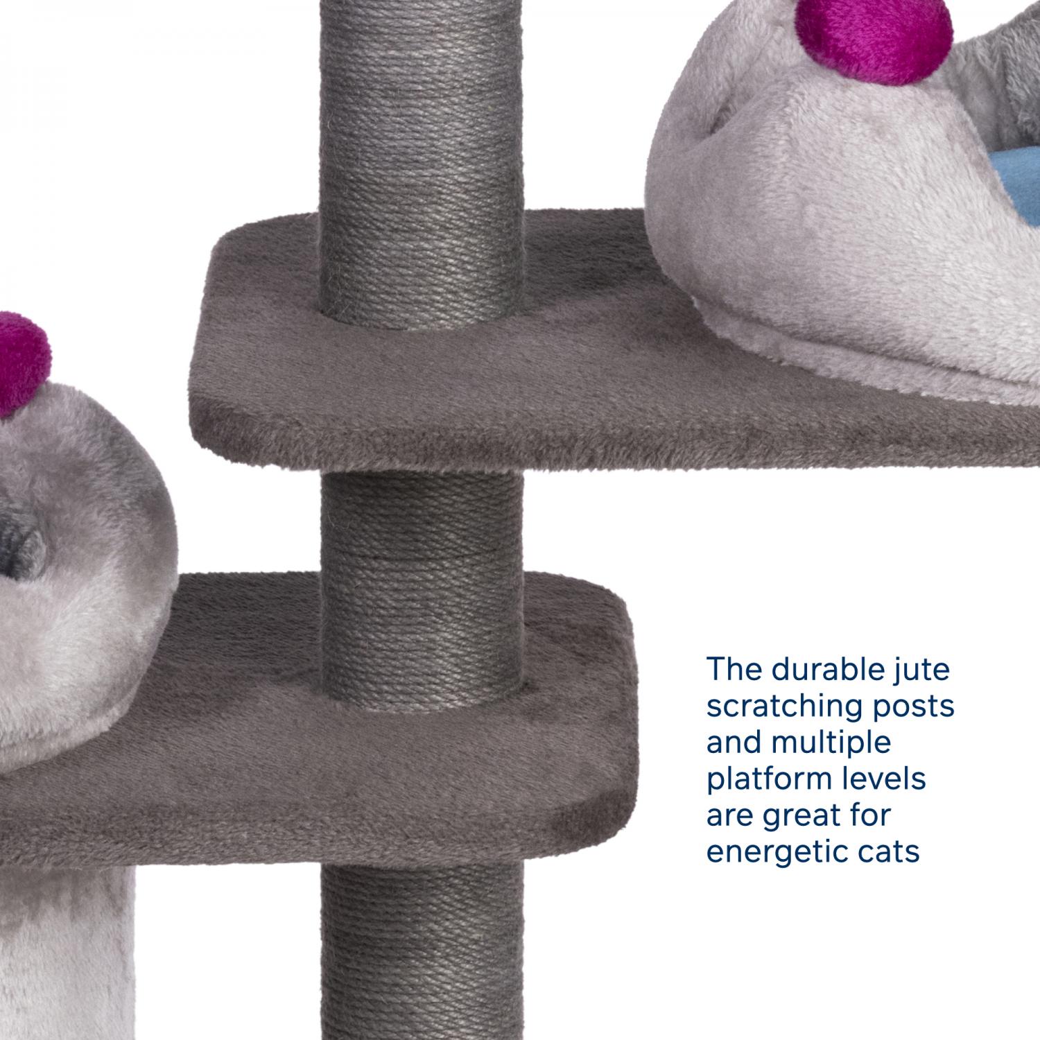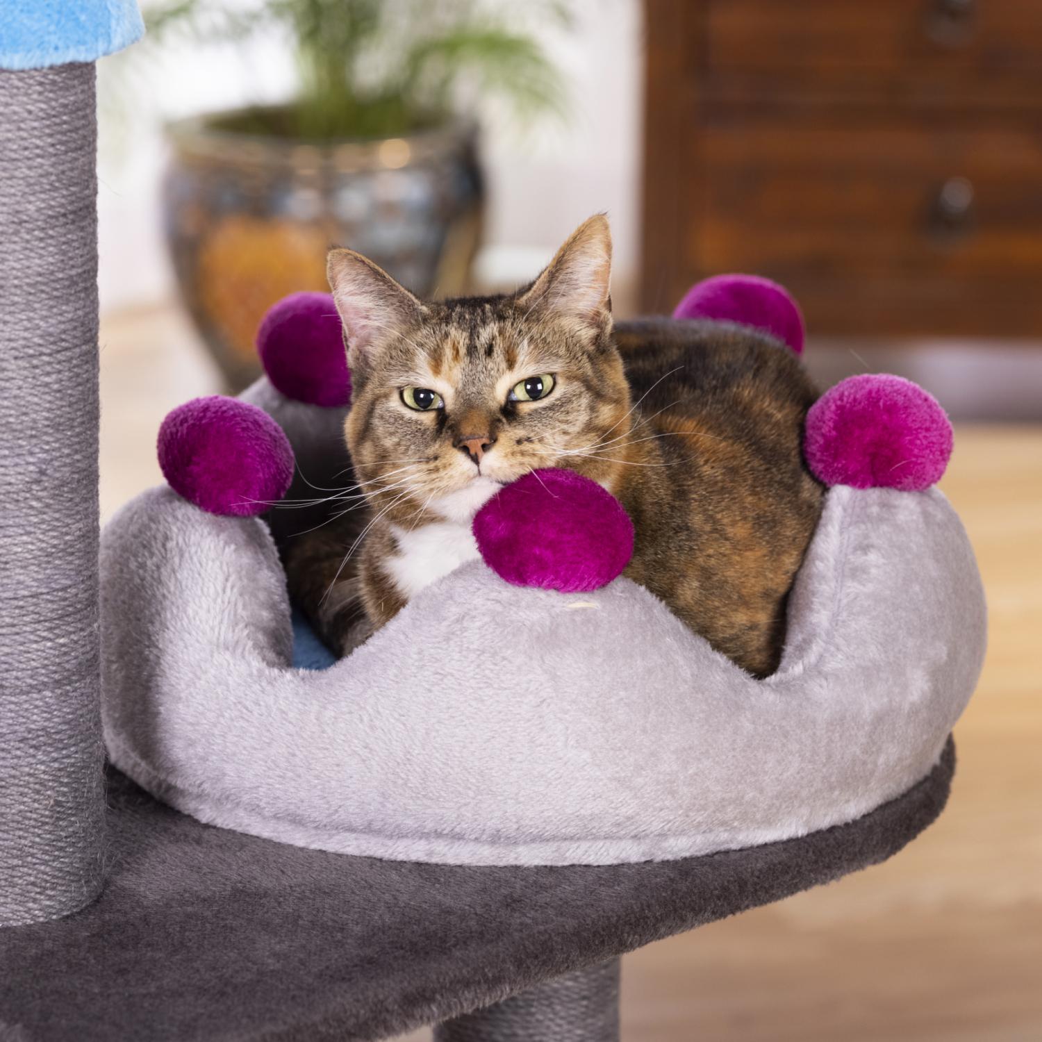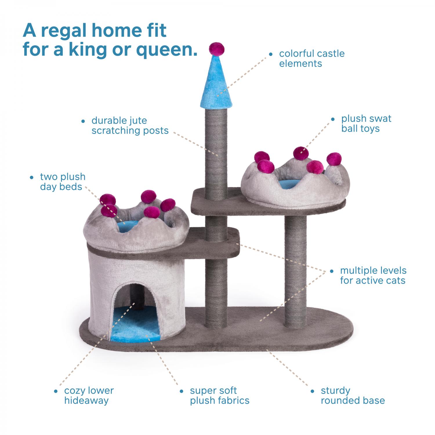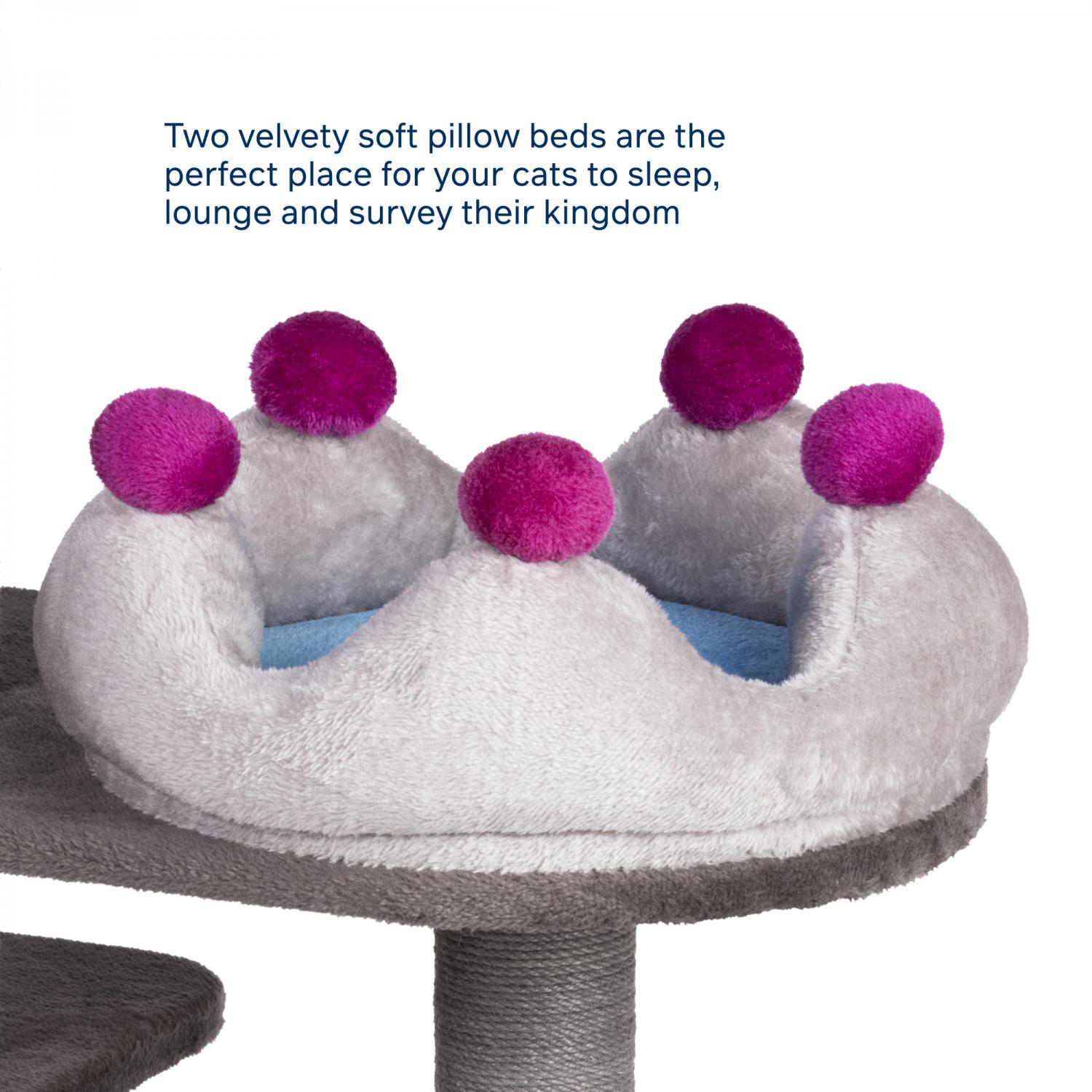 King’s Castle (#7352) from Prevue Pet Products gives your cat the royal treatment! With places to sleep, stretch, hide, and play, this cat tower features two pillowy, elevated day beds, plush pom pom swat toys, a durable jute scratching post, and a cozy, lower-level hideaway. This plush cat tower encourages exercise as your cat scratches, grooms nails, and strengthens their paws. With colorful, super soft fabrics, this whimsical multi-level King’s Castle adds a regal presence to any room! Dimensions: 37-3/4"L x 16"W x 40-3/8"H.