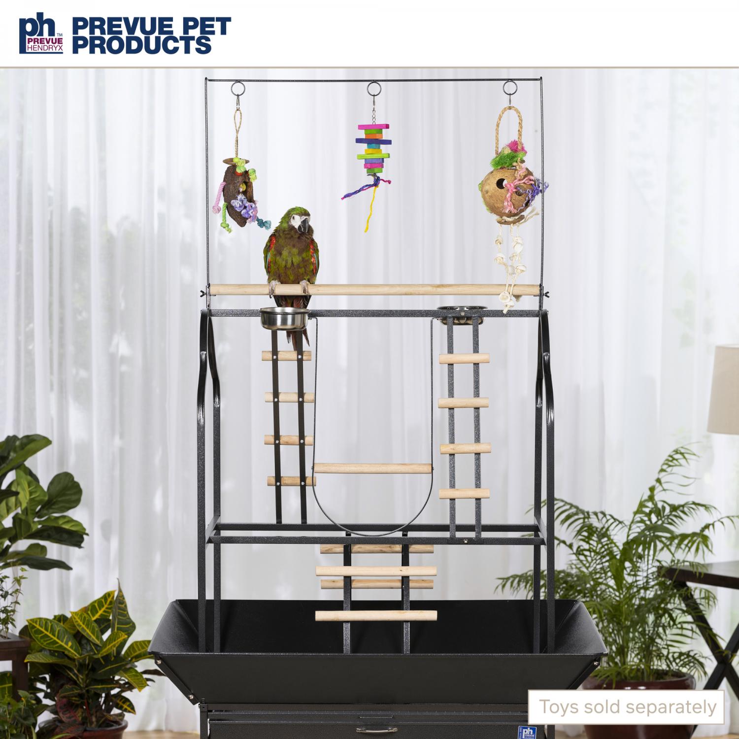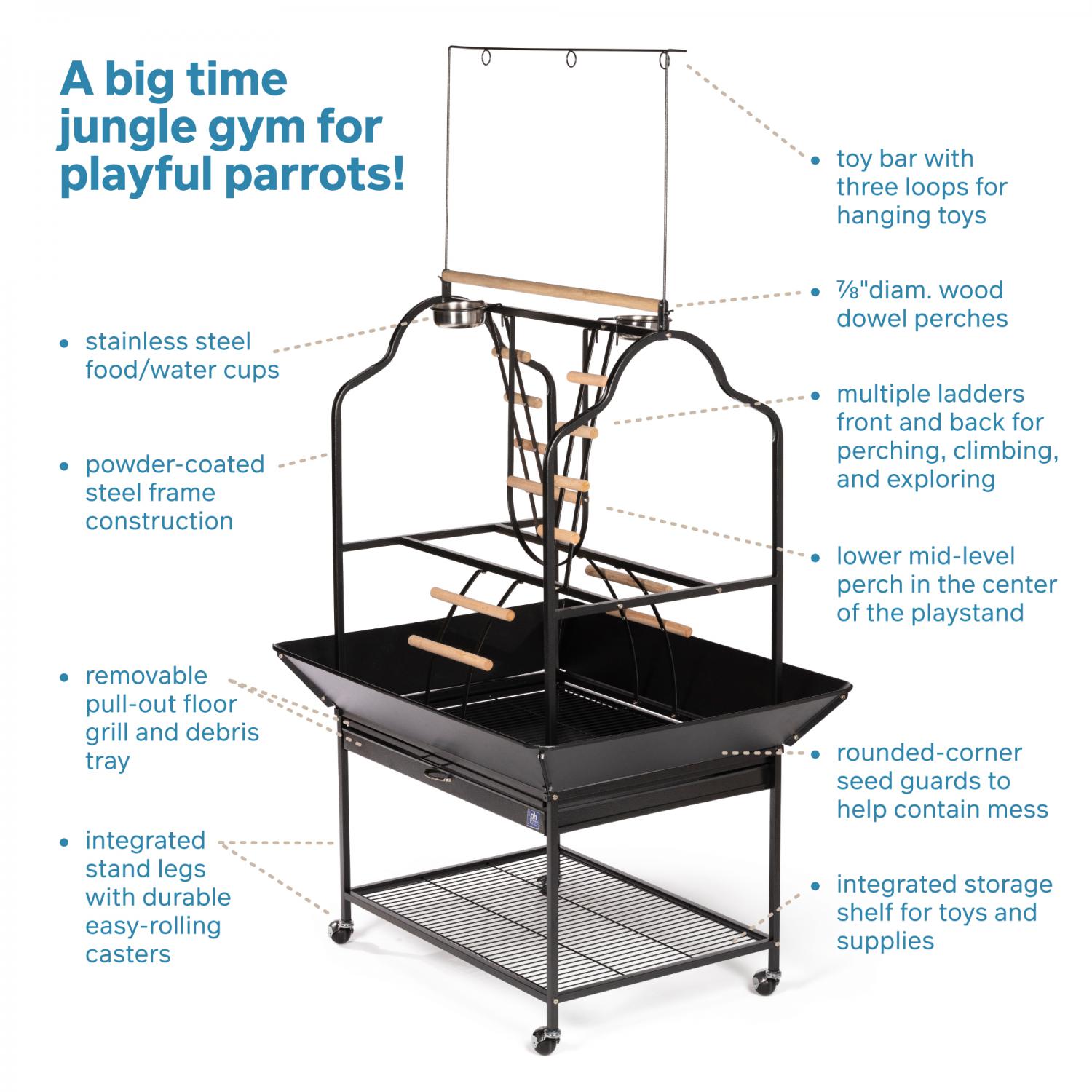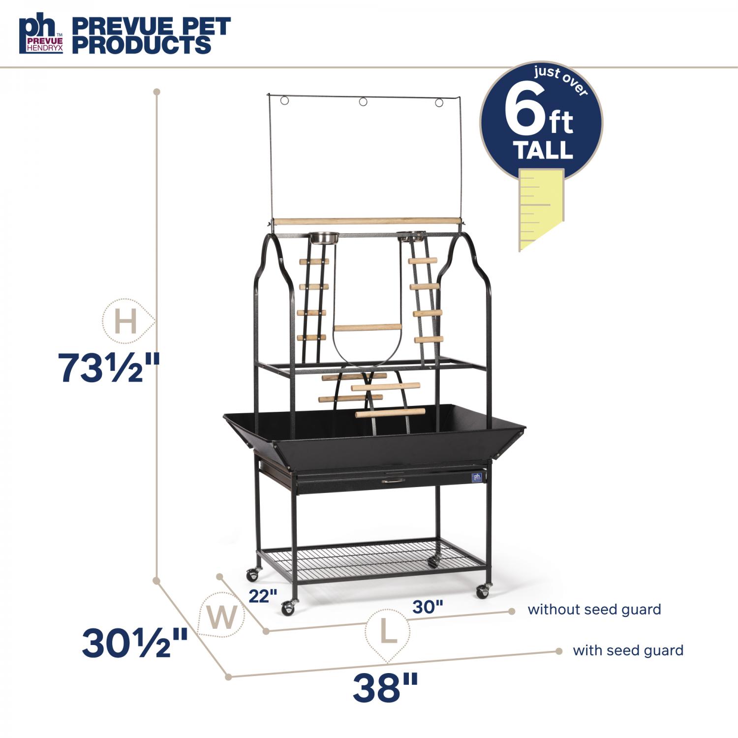 Large Parrot Playstand (#3180BLK) from Prevue Pet Products includes many features to keep your bird entertained — from the toy hook hanging bar and upper full-width perch, to the multiple ladders and varied resting and climbing spots. Double stainless steel cups provide room for food, water, or treats, and the smooth-rolling caster stand lets you easily move the playstand around your home. The deep pull-out debris tray and rounded corner seed guard provide stress-free cleaning, while the integrated storage shelf gives space for food, treats, toys, and cleaning supplies. Dimensions: 30"L x 22"W x 73-1/2"H.