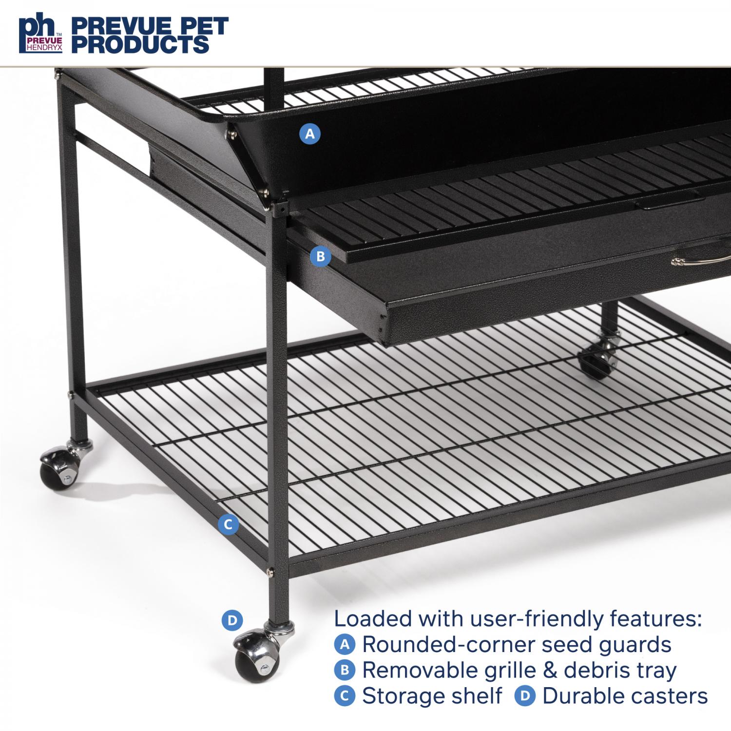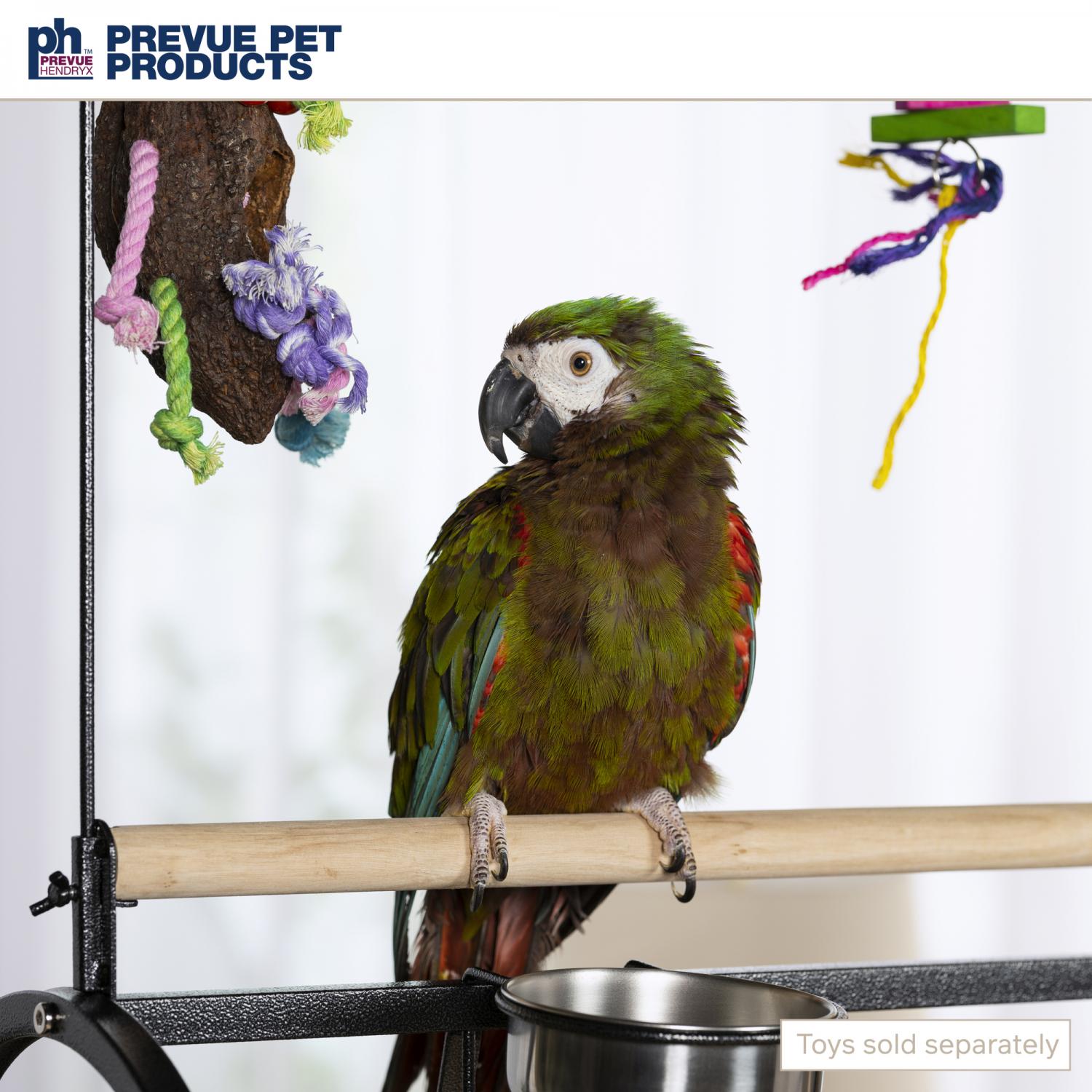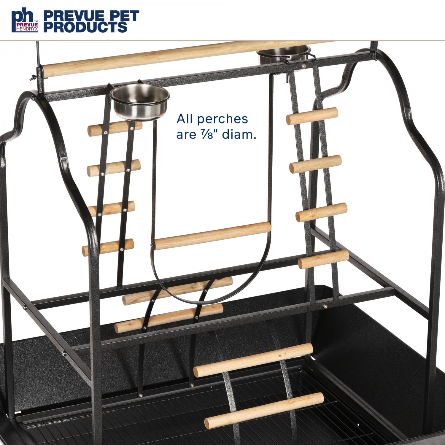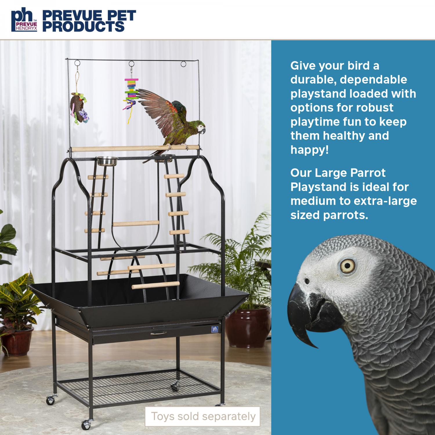 Large Parrot Playstand (#3180BLK) from Prevue Pet Products includes many features to keep your bird entertained — from the toy hook hanging bar and upper full-width perch, to the multiple ladders and varied resting and climbing spots. Double stainless steel cups provide room for food, water, or treats, and the smooth-rolling caster stand lets you easily move the playstand around your home. The deep pull-out debris tray and rounded corner seed guard provide stress-free cleaning, while the integrated storage shelf gives space for food, treats, toys, and cleaning supplies. Dimensions: 30"L x 22"W x 73-1/2"H.