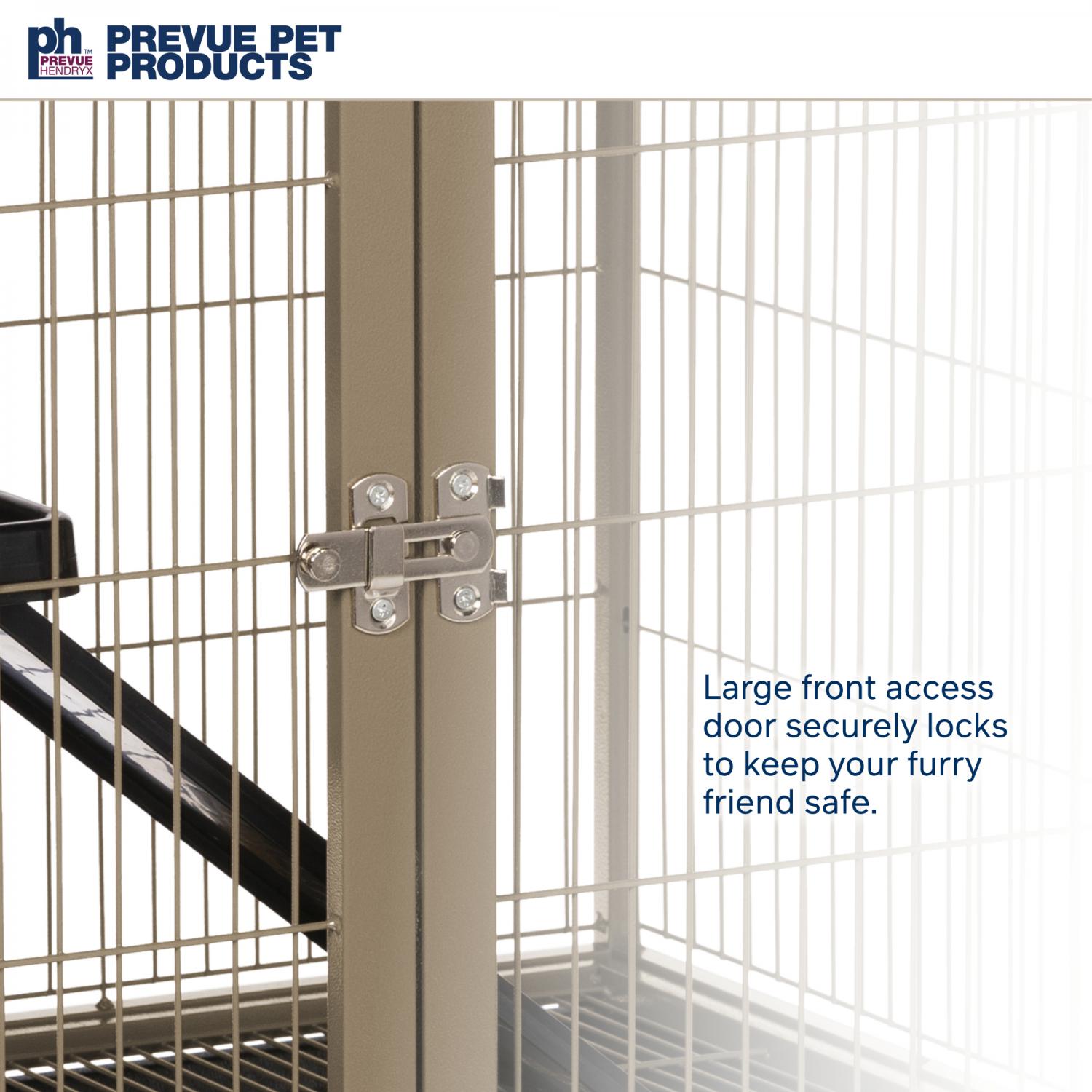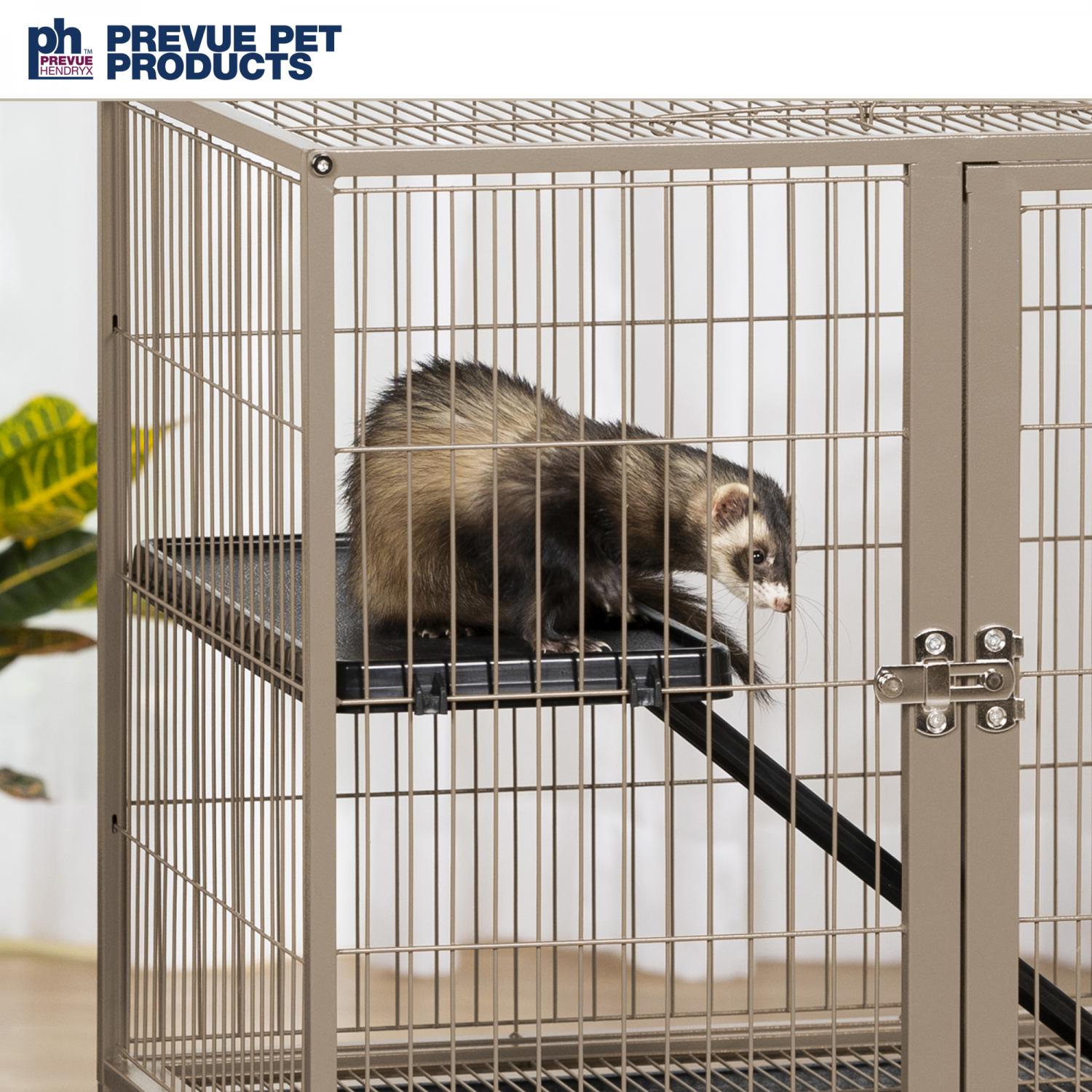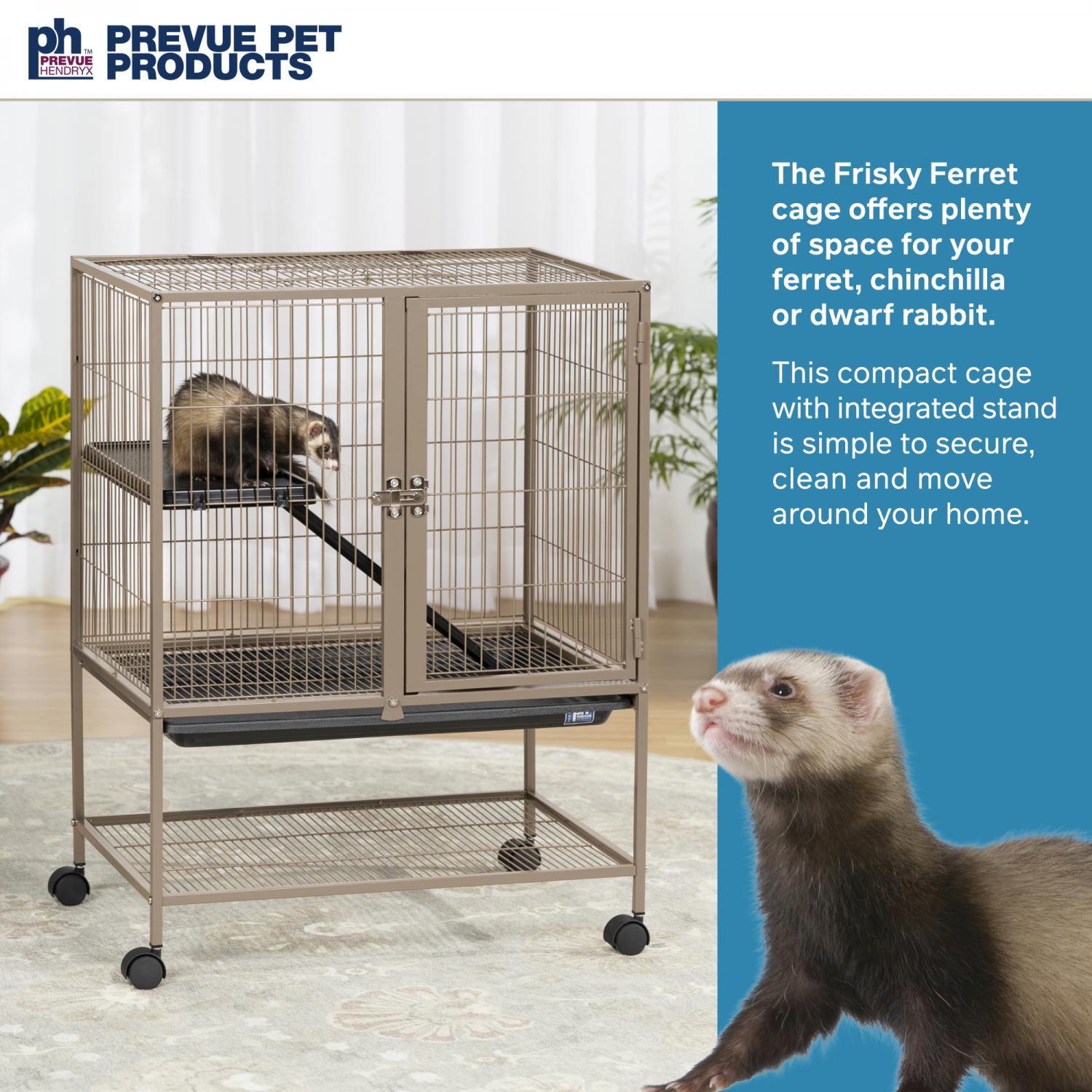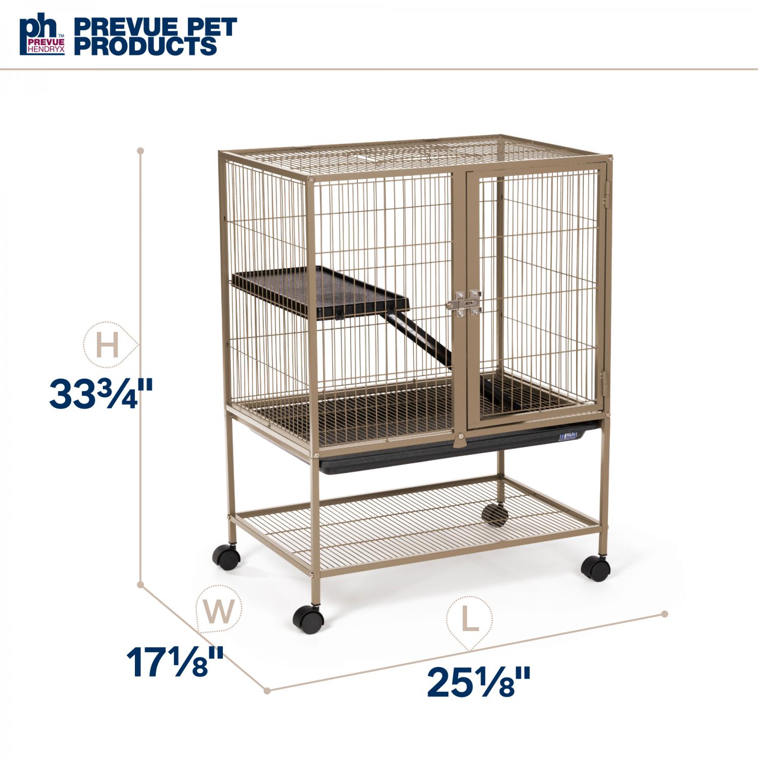 Frisky Ferret Cage (#486) from Prevue Pet Products offers a spacious home for your ferret or chinchilla. The cage comes complete with one ramp and platform to keep your fuzzy friend content. Featuring large doors in the front and on top for easy pet access. Platform, grille, and debris tray are all removable for convenient cleaning. Castered stand provides portability from room to room, while the space saving shelf holds toys, treats, and supplies. Dimensions: 25-1/8"L x 17-1/8"W x 33-3/4"H.