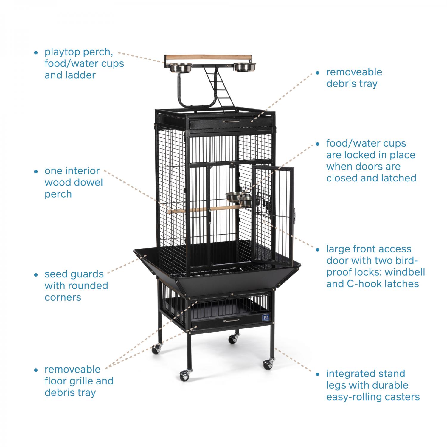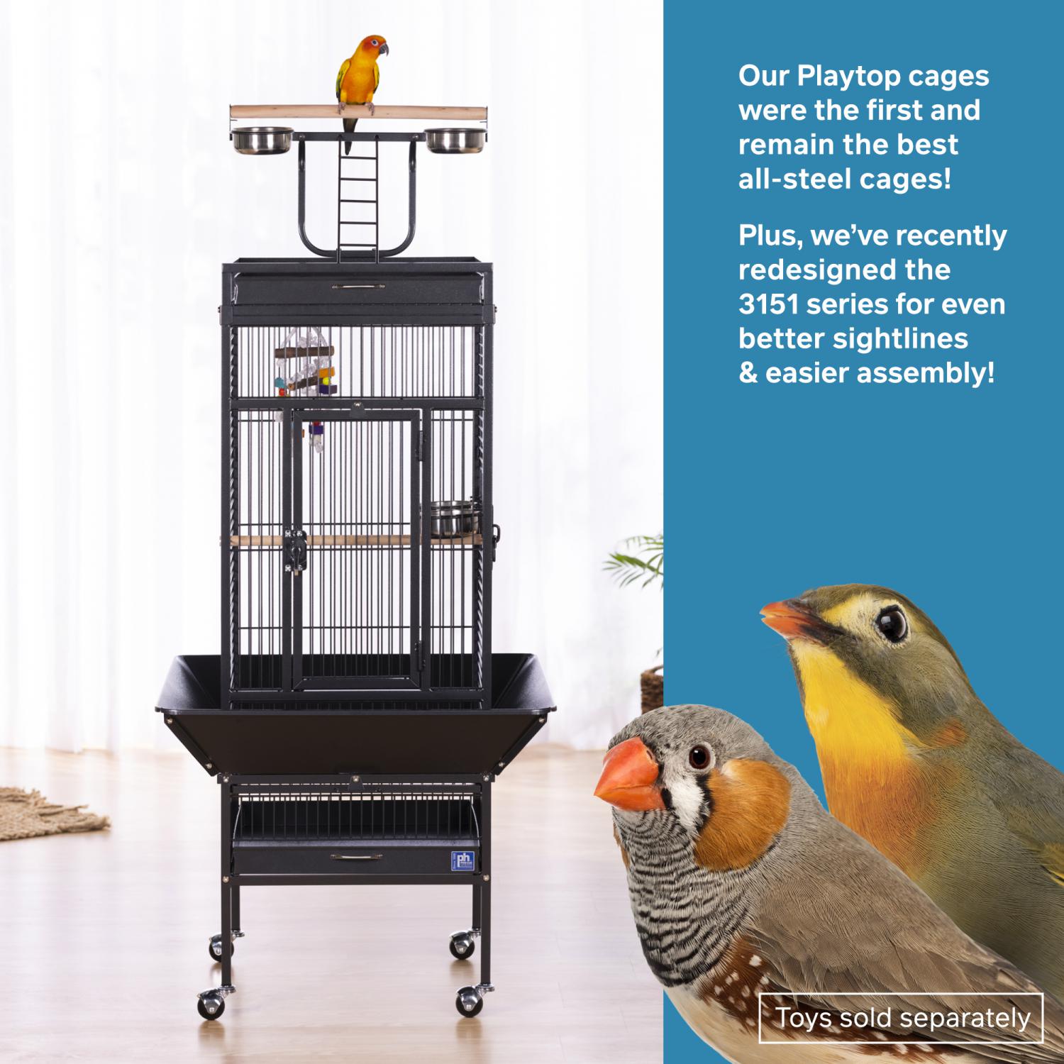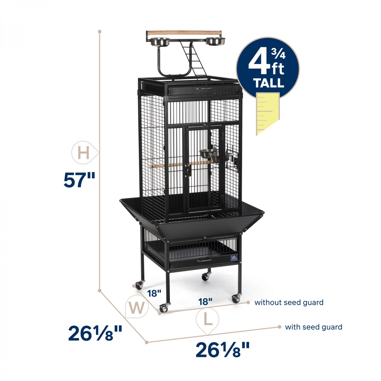 Playtop Bird Home - Black (#3151BLK) from Prevue Pet Products features quality powder-coated steel construction at an affordable cost. A cagetop playstand keeps your bird entertained, while the heavy-duty push button lock keeps your bird securely inside its cage when playtime is over. Also includes four stainless steel cups, two wood perches, and an easy-rolling caster stand for portability. Both debris trays and the floor grille are removable for simple cleaning, and the rounded corner seed guards control mess around the cage. Dimensions: 18"L x 18"W x 57"H. Wire spacing: 3/4".