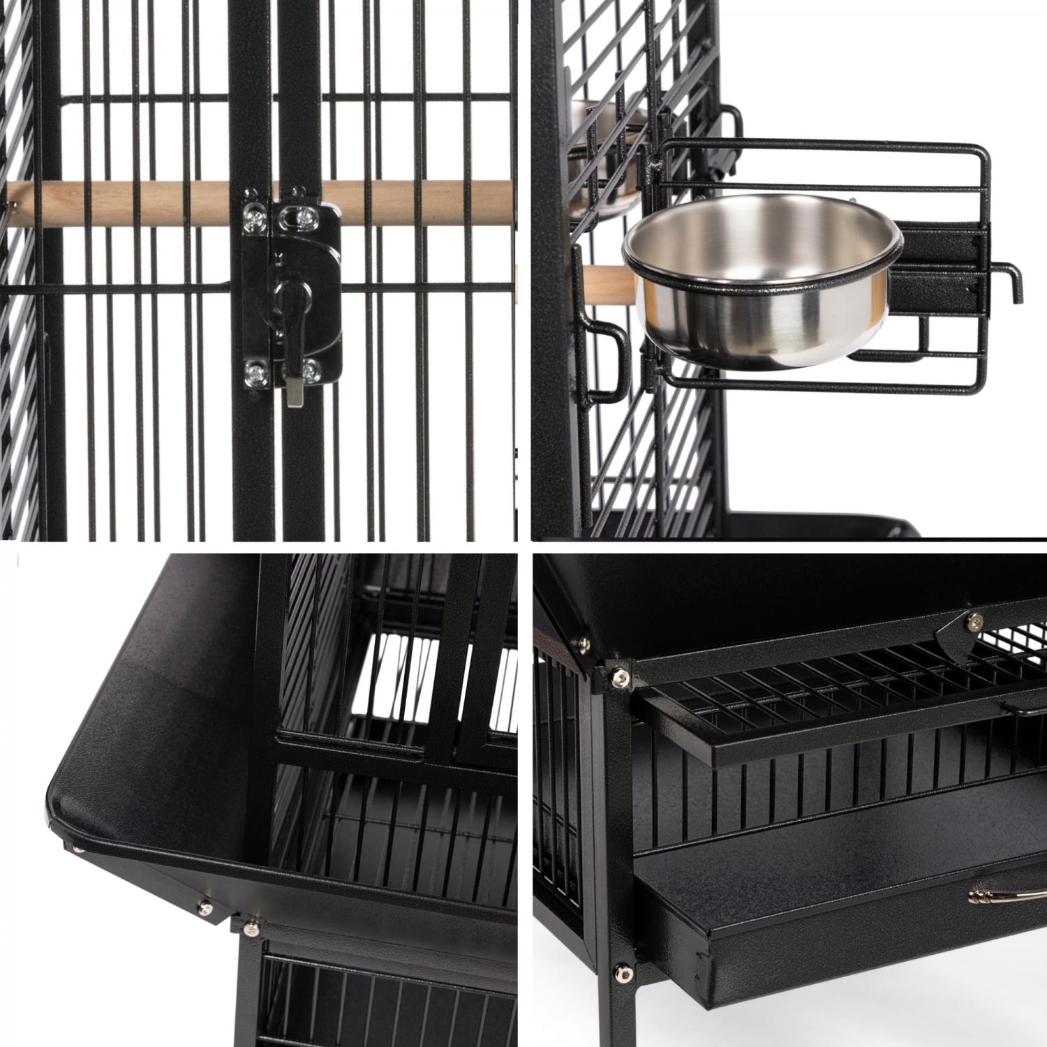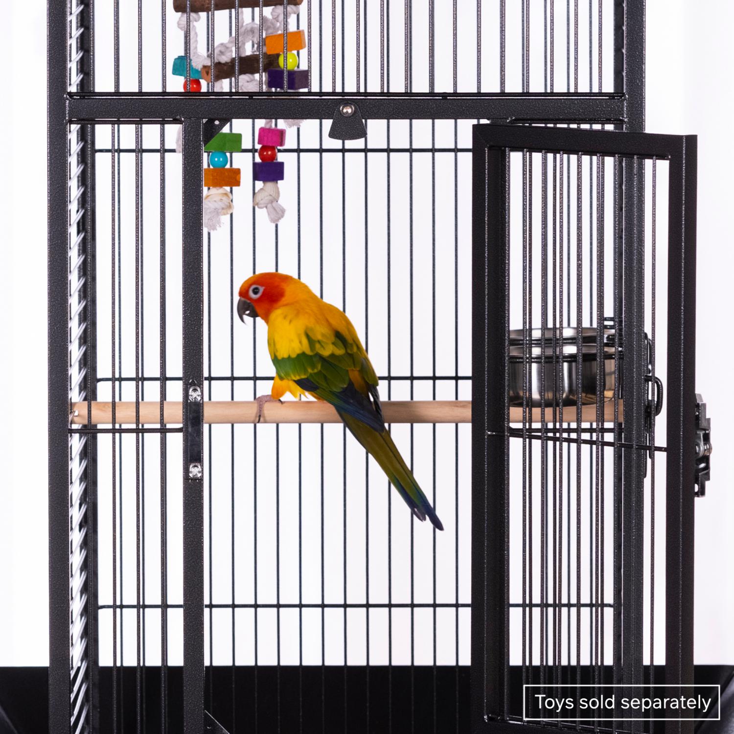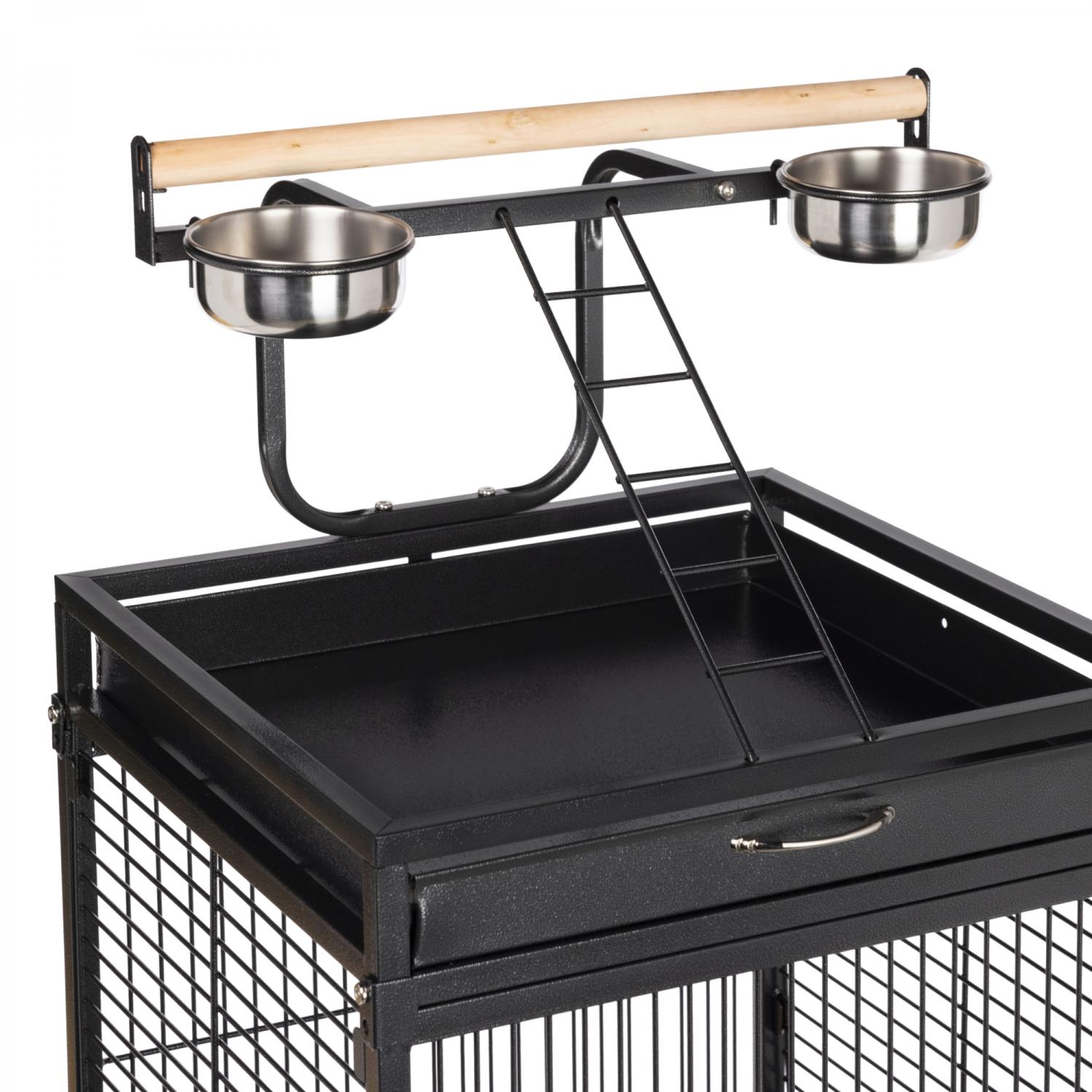 Playtop Bird Home - Black (#3151BLK) from Prevue Pet Products features quality powder-coated steel construction at an affordable cost. A cagetop playstand keeps your bird entertained, while the heavy-duty push button lock keeps your bird securely inside its cage when playtime is over. Also includes four stainless steel cups, two wood perches, and an easy-rolling caster stand for portability. Both debris trays and the floor grille are removable for simple cleaning, and the rounded corner seed guards control mess around the cage. Dimensions: 18"L x 18"W x 57"H. Wire spacing: 3/4".