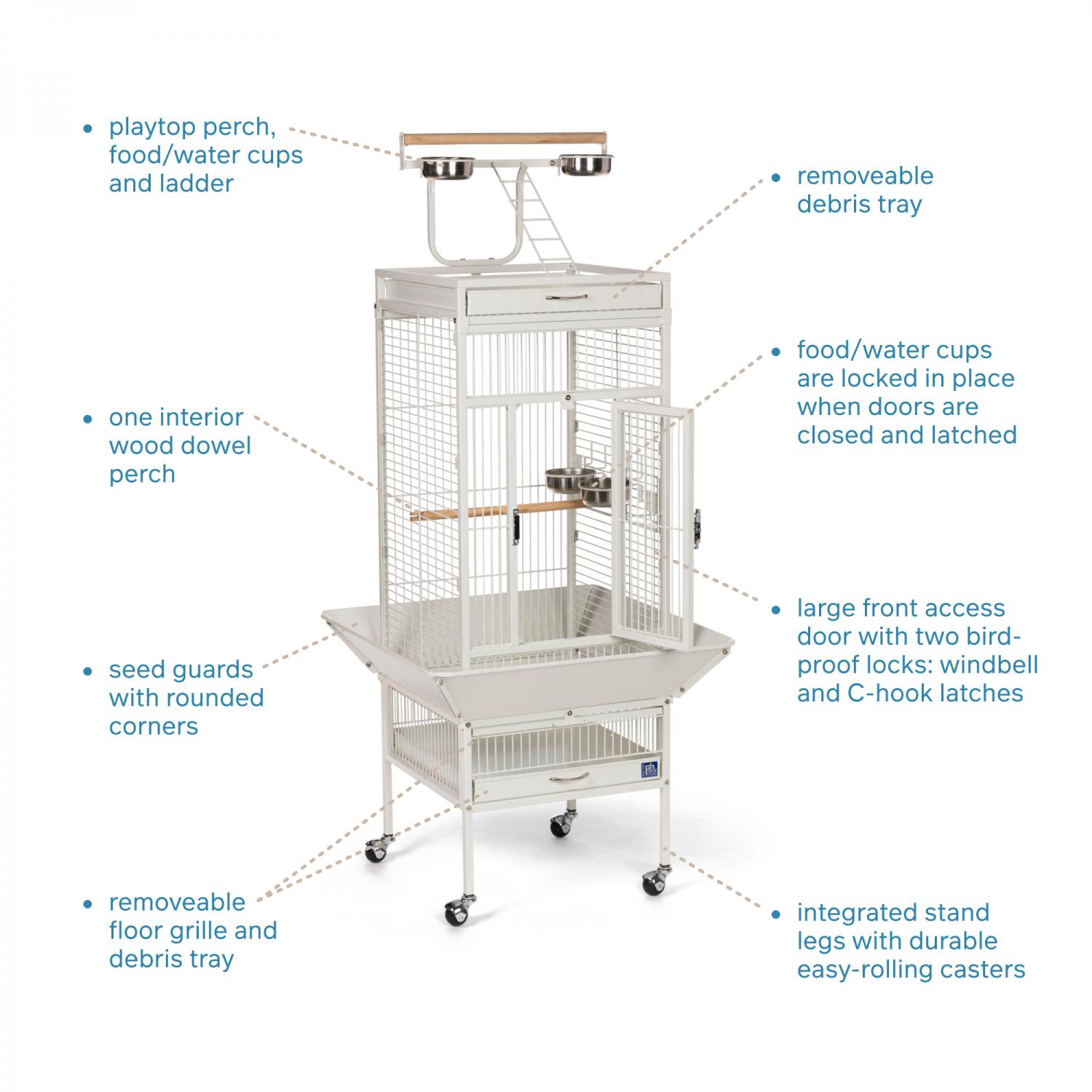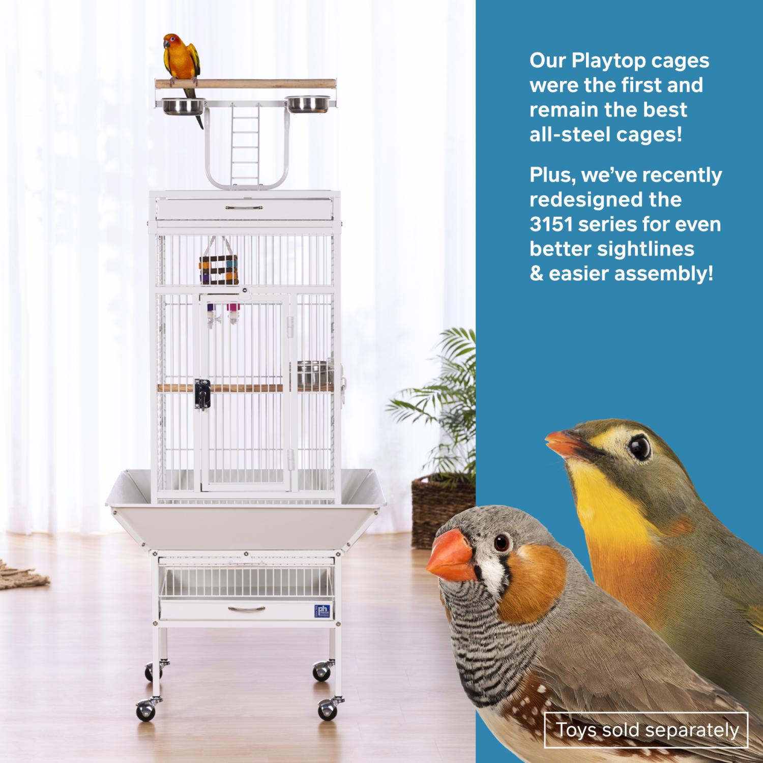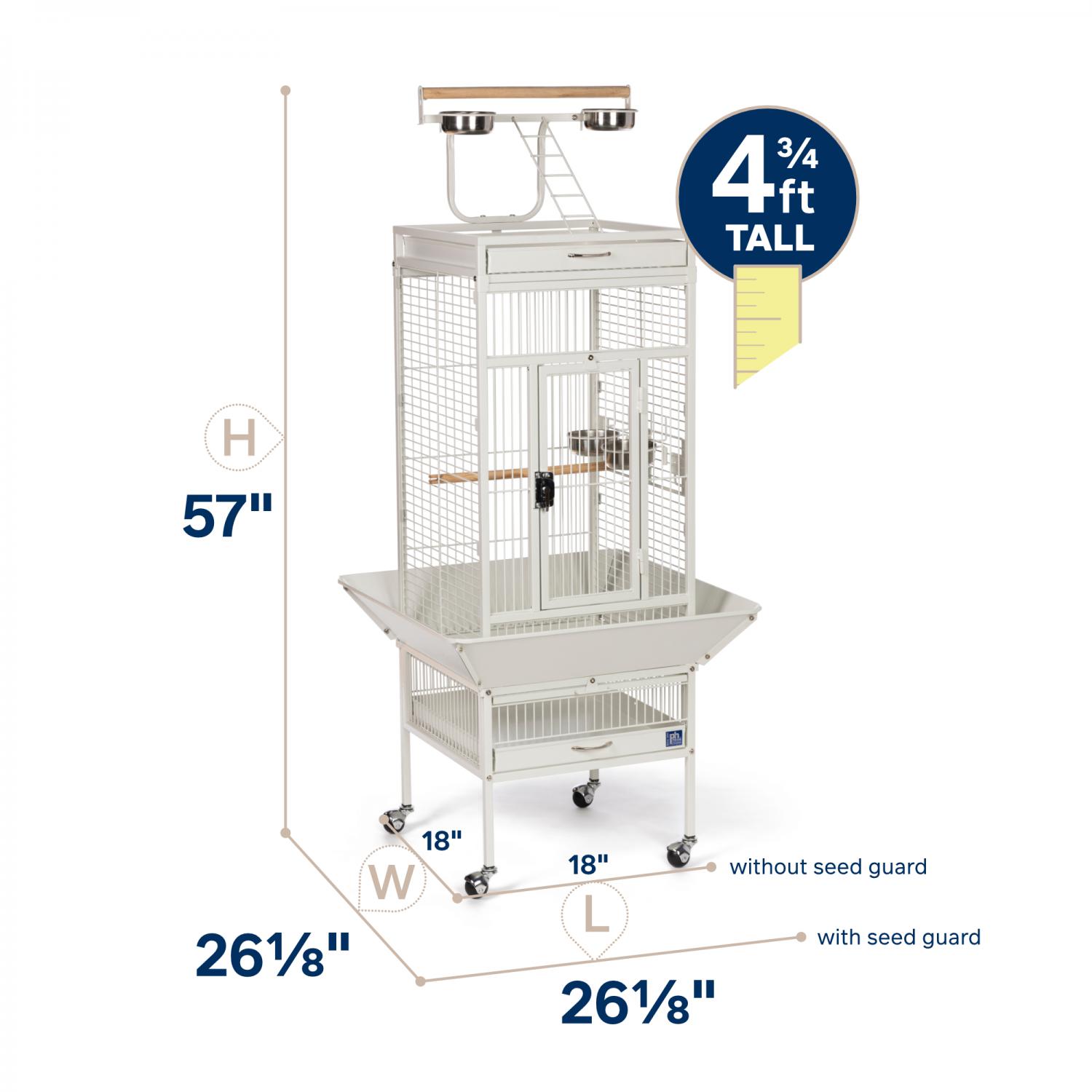 Playtop Bird Home - Chalk White (#3151C) from Prevue Pet Products features quality powder-coated steel construction at an affordable cost. A cagetop playstand keeps your bird entertained, while the heavy-duty push button lock keeps your bird securely inside its cage when playtime is over. Also includes four stainless steel cups, two wood perches, and an easy-rolling caster stand for portability. Both debris trays and the floor grille are removable for simple cleaning, and the rounded corner seed guards control mess around the cage. Dimensions: 18"L x 18"W x 57"H. Wire spacing: 3/4".
