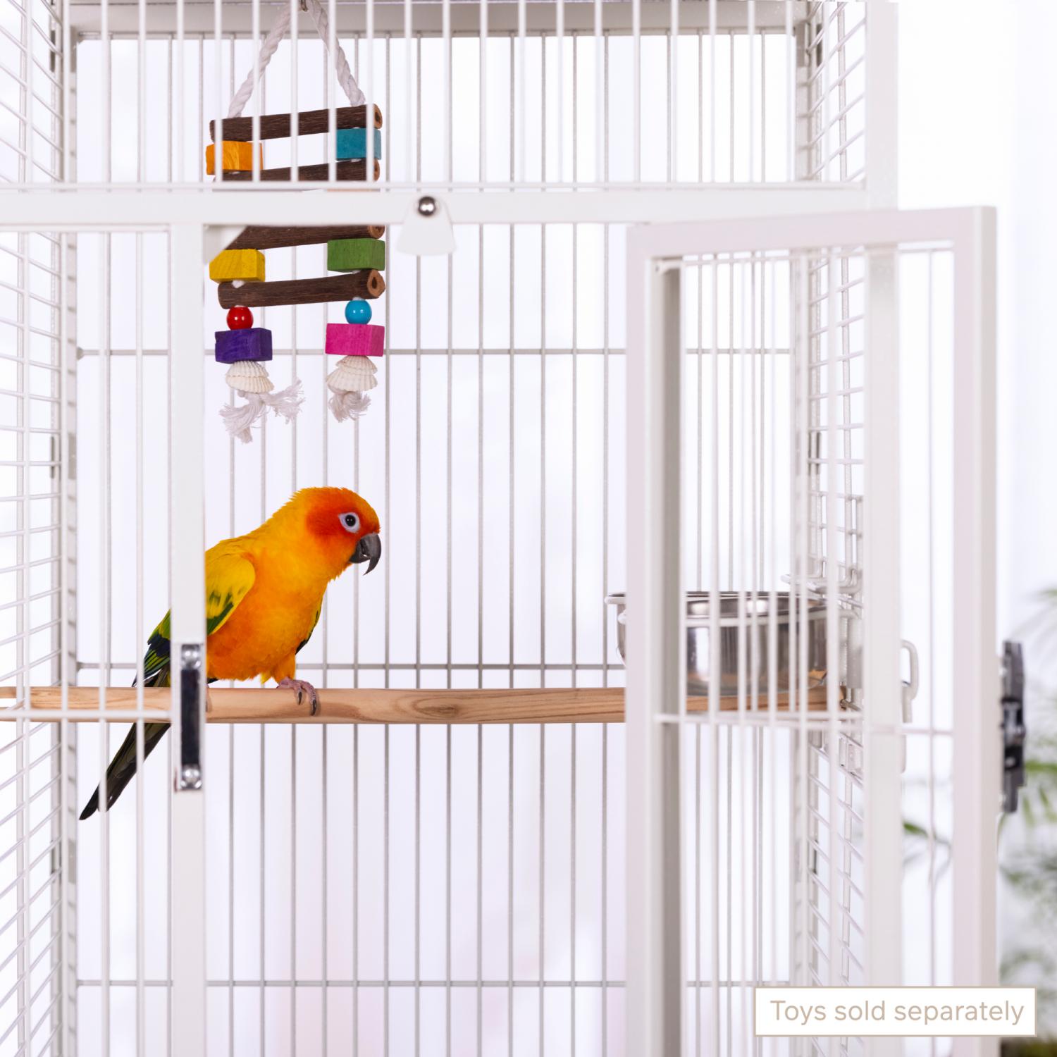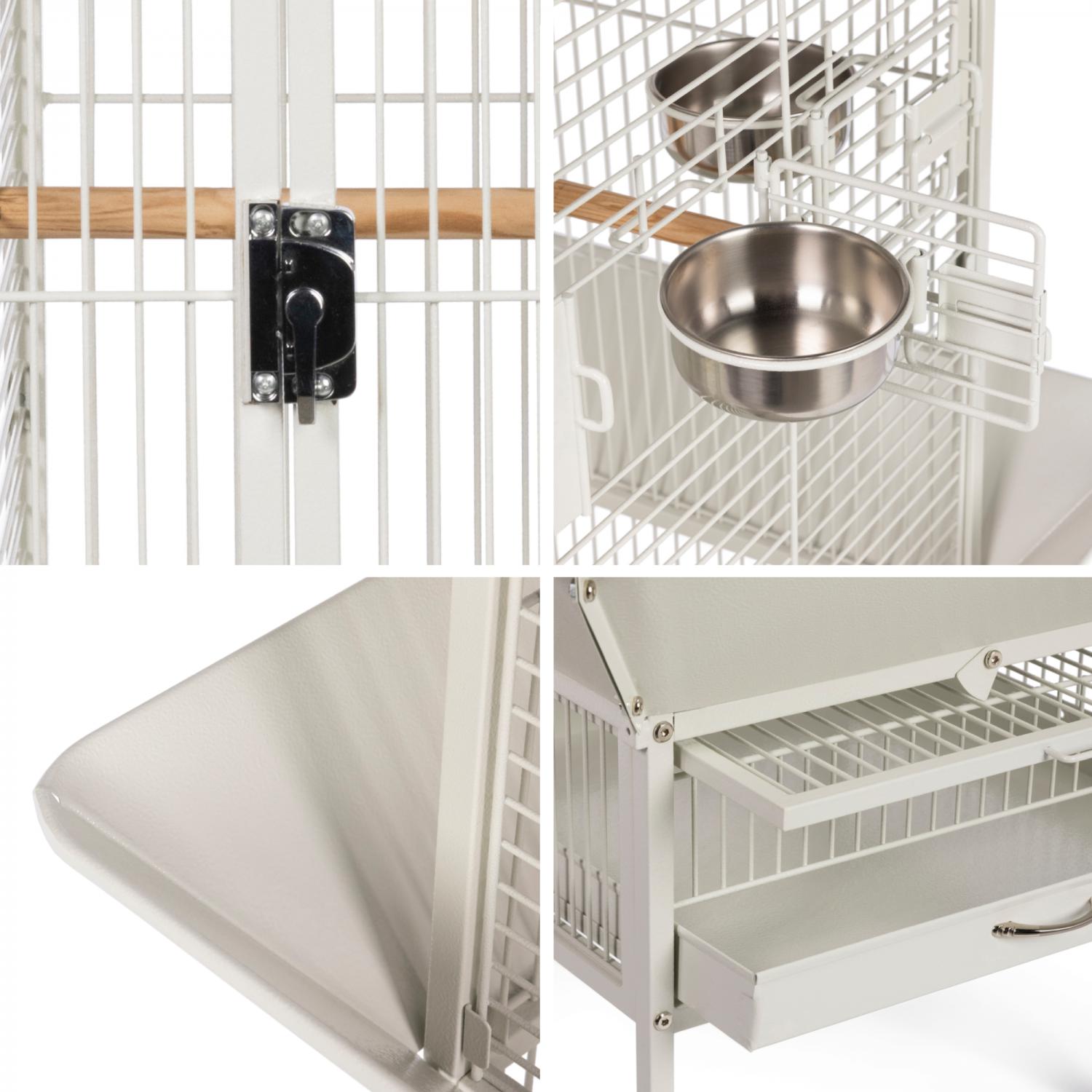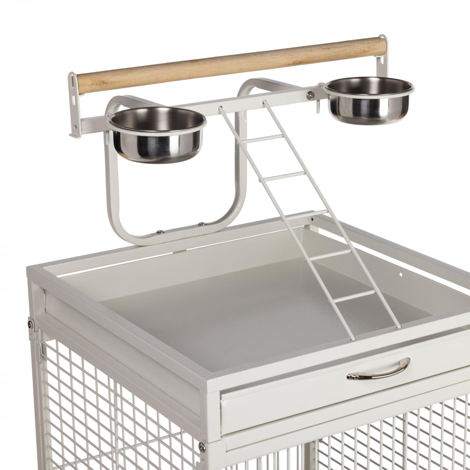 Playtop Bird Home - Chalk White (#3151C) from Prevue Pet Products features quality powder-coated steel construction at an affordable cost. A cagetop playstand keeps your bird entertained, while the heavy-duty push button lock keeps your bird securely inside its cage when playtime is over. Also includes four stainless steel cups, two wood perches, and an easy-rolling caster stand for portability. Both debris trays and the floor grille are removable for simple cleaning, and the rounded corner seed guards control mess around the cage. Dimensions: 18"L x 18"W x 57"H. Wire spacing: 3/4".