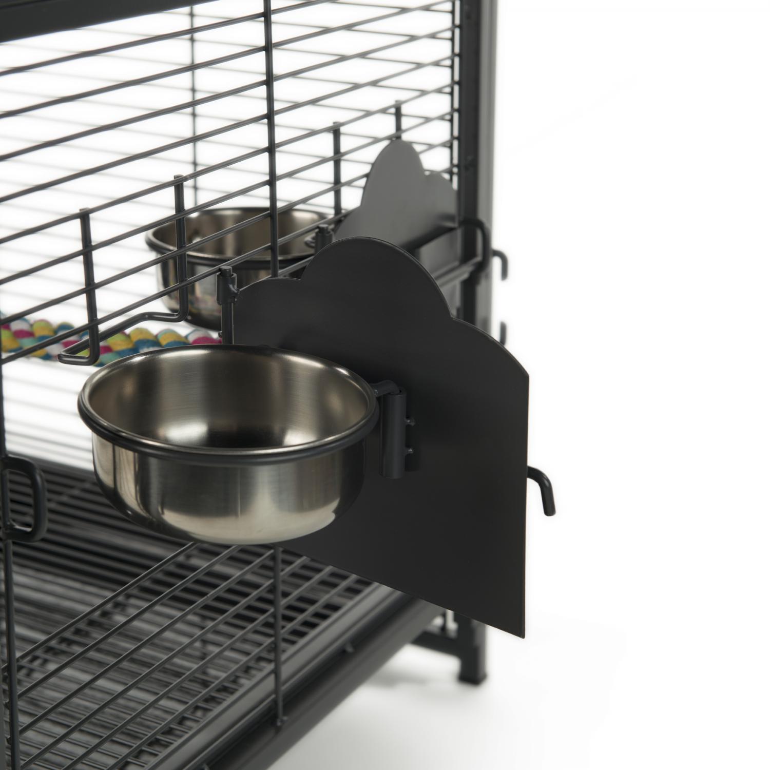 Travel Carrier (#1307) from Prevue Pet Products is an ideal bird cage for short term use, traveling, or emergency situations. The sturdy powder coated steel construction is rust-resistant and lighter than other travel cages on the market. Offers plenty of interior space for small–large sized birds, kept secure with a bird-proof door lock. The stainless steel lock-in-place cups won’t be dislodged by your bird, and solid cup doors prevent spilling. Removable floor grille and debris tray pull out for easy cleaning, but stay in place with a windbell lock. Also includes one shapeable, foot-friendly rope perch and a wooden perch playtop. For vehicle travel, innovative welded seat belt brackets allow you to conveniently buckle in your cage. Dimensions: 18-3/4"L x 14-7/8"W x 25"H. Wire spacing: 1/2".
