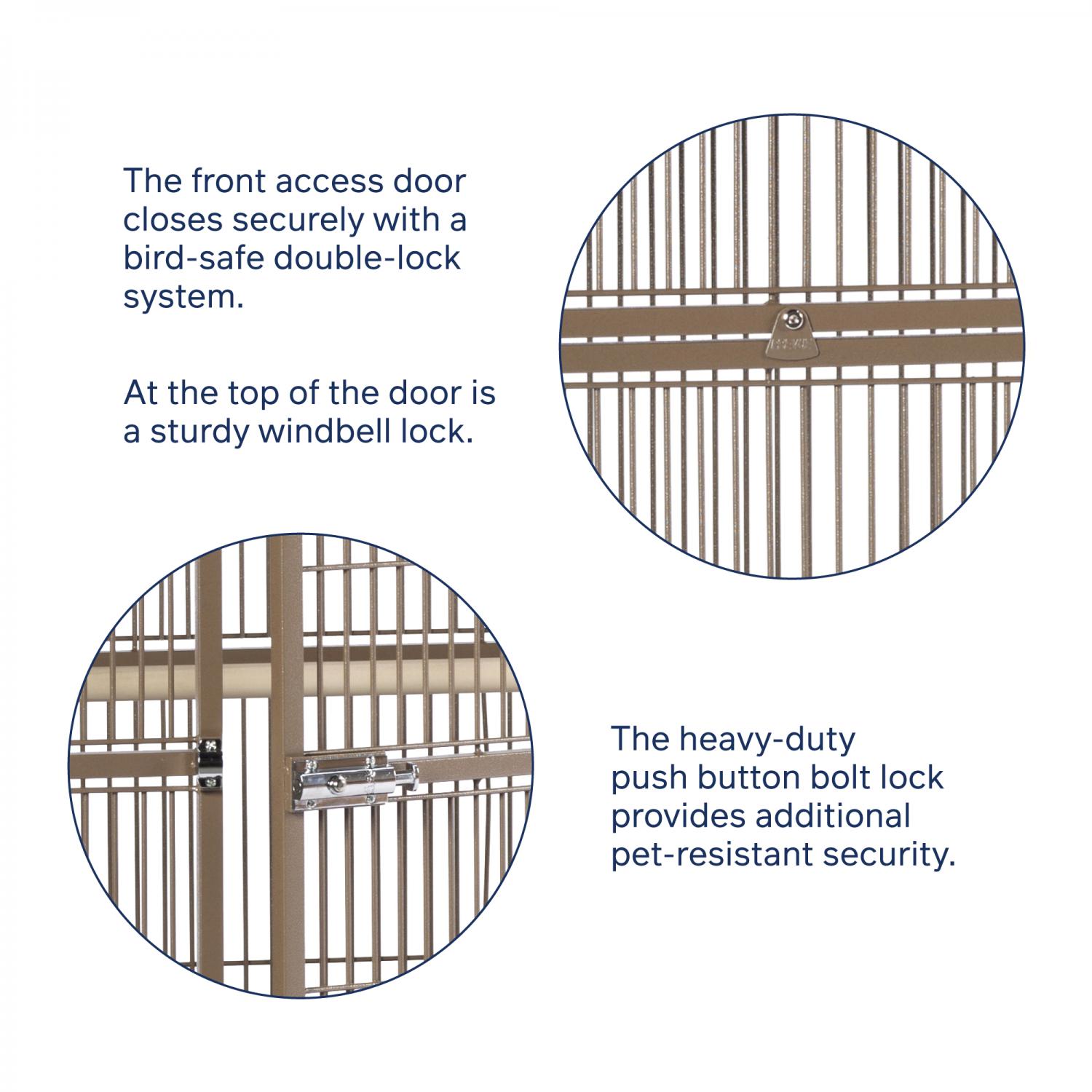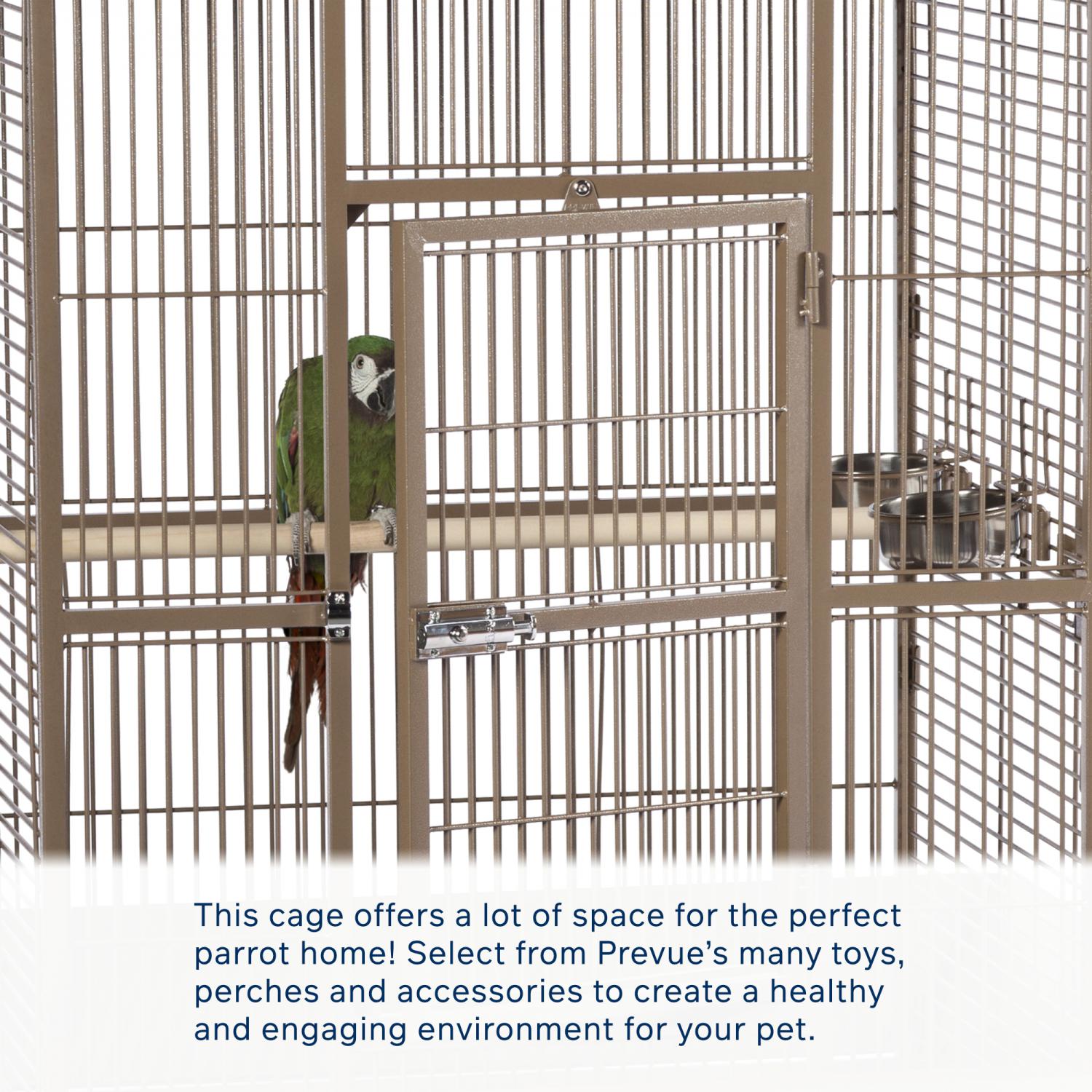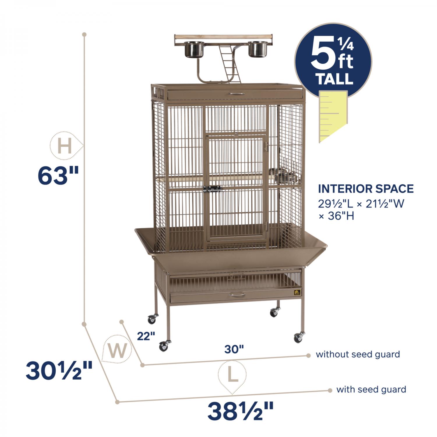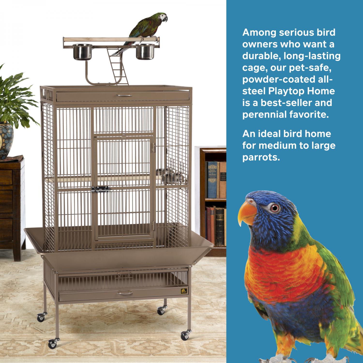 Playtop Bird Home - Coco (#3153COCO) from Prevue Pet Products features quality powder-coated steel construction at an affordable cost. A cagetop playstand keeps your bird entertained, while the heavy-duty push button lock keeps your bird securely inside its cage when playtime is over. Also includes four stainless steel cups, two wood perches, and an easy-rolling caster stand for portability. Both debris trays and the floor grille are removable for simple cleaning, and the rounded corner seed guards control mess around the cage. Dimensions: 30"L x 22"W x 63"H. Wire spacing: 3/4".