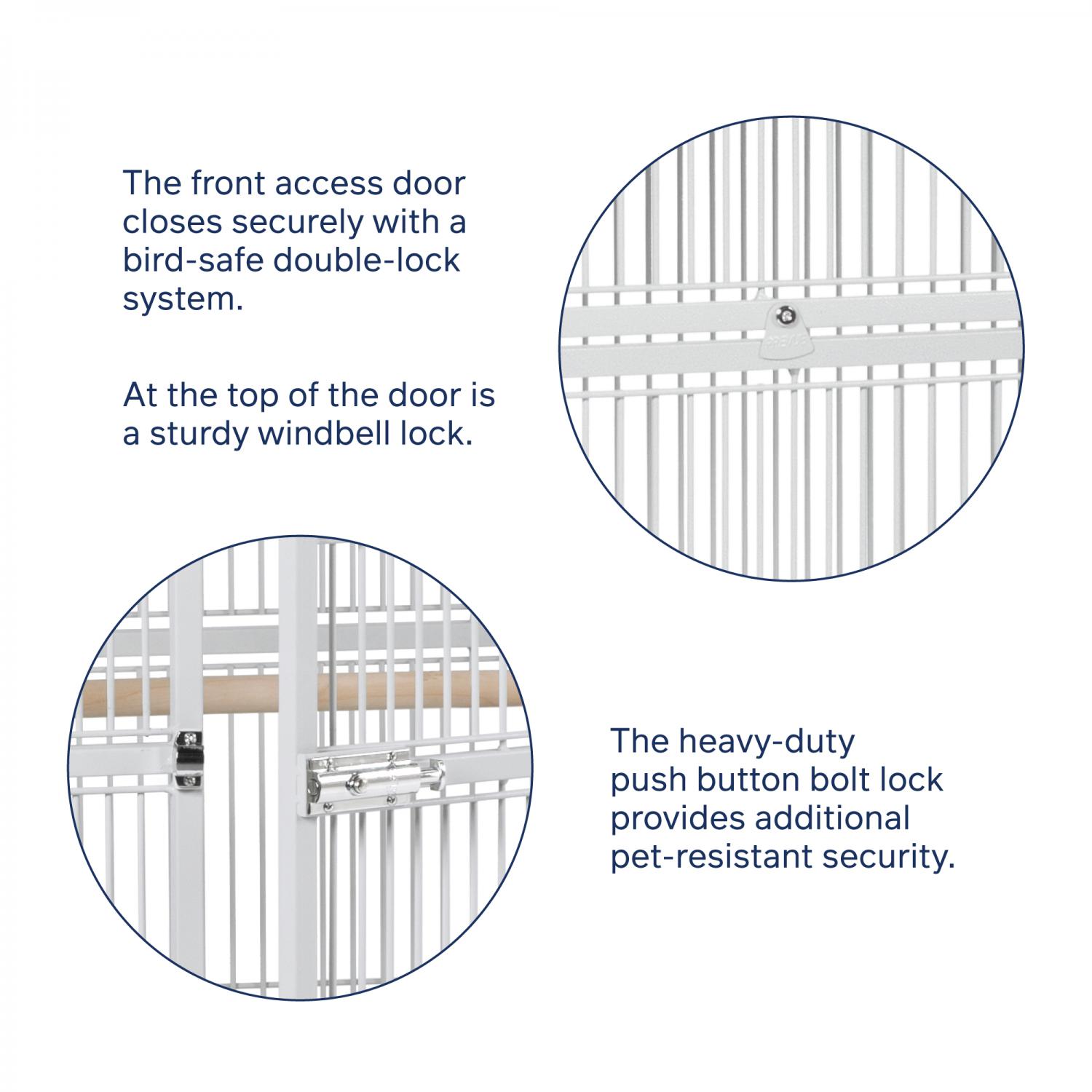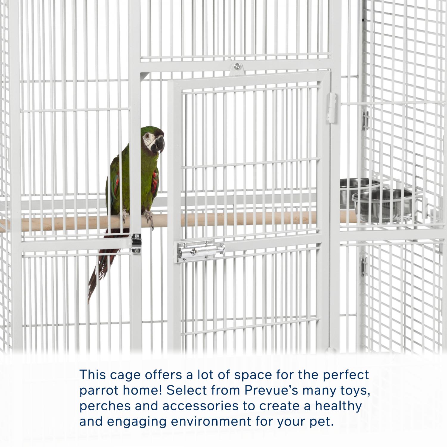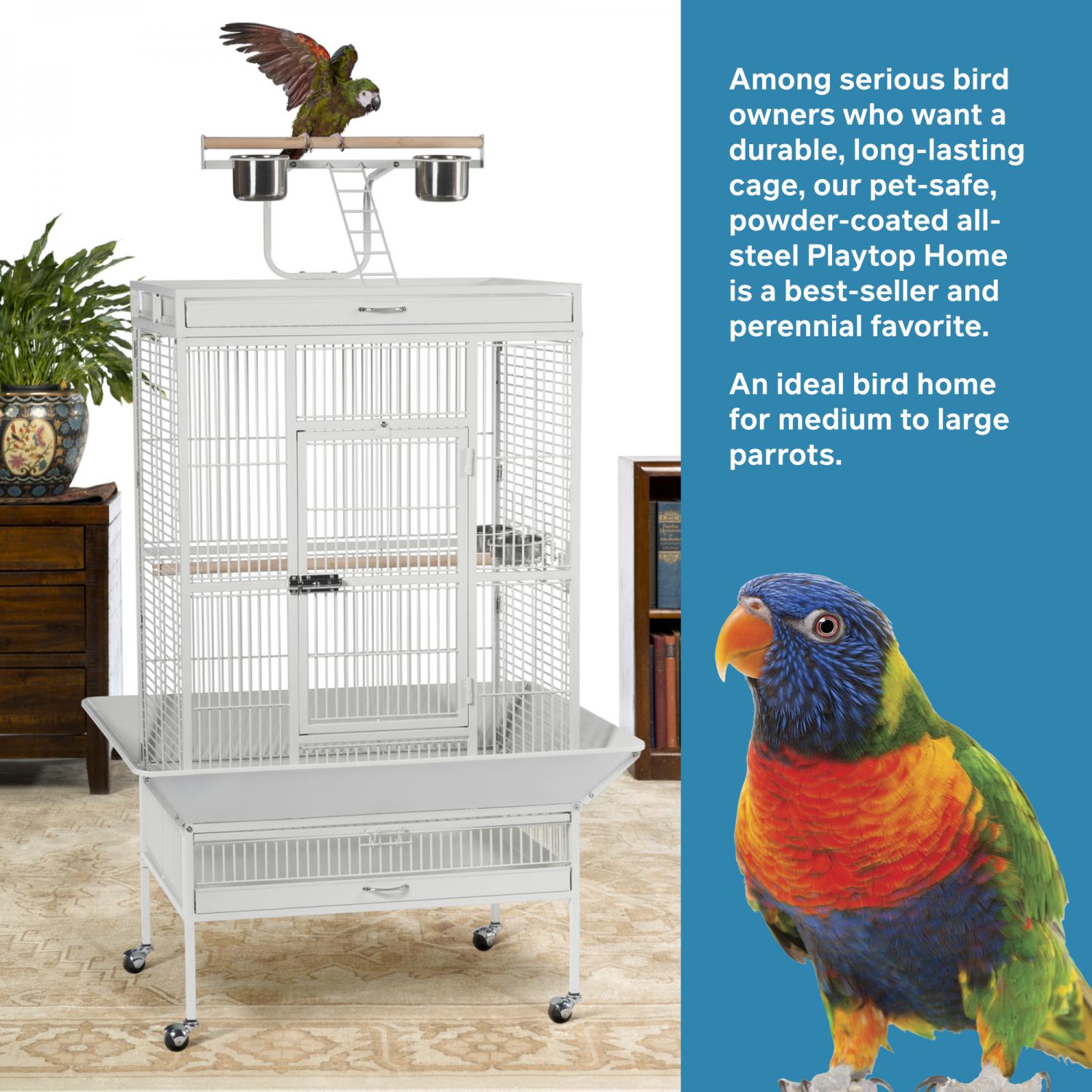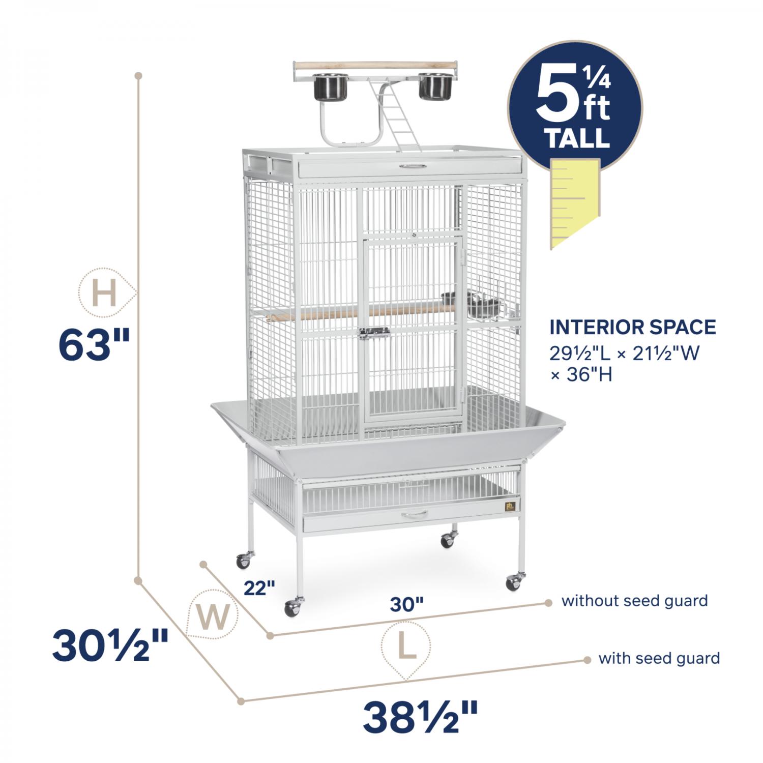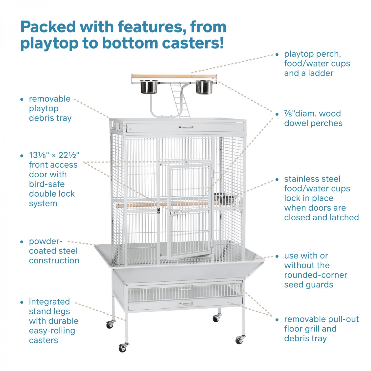 Playtop Bird Home - Pewter White (#3153W) from Prevue Pet Products features quality powder-coated steel construction at an affordable cost. A cagetop playstand keeps your bird entertained, while the heavy-duty push button lock keeps your bird securely inside its cage when playtime is over. Also includes four stainless steel cups, two wood perches, and an easy-rolling caster stand for portability. Both debris trays and the floor grille are removable for simple cleaning, and the rounded corner seed guards control mess around the cage. Dimensions: 30"L x 22"W x 63"H. Wire spacing: 3/4".