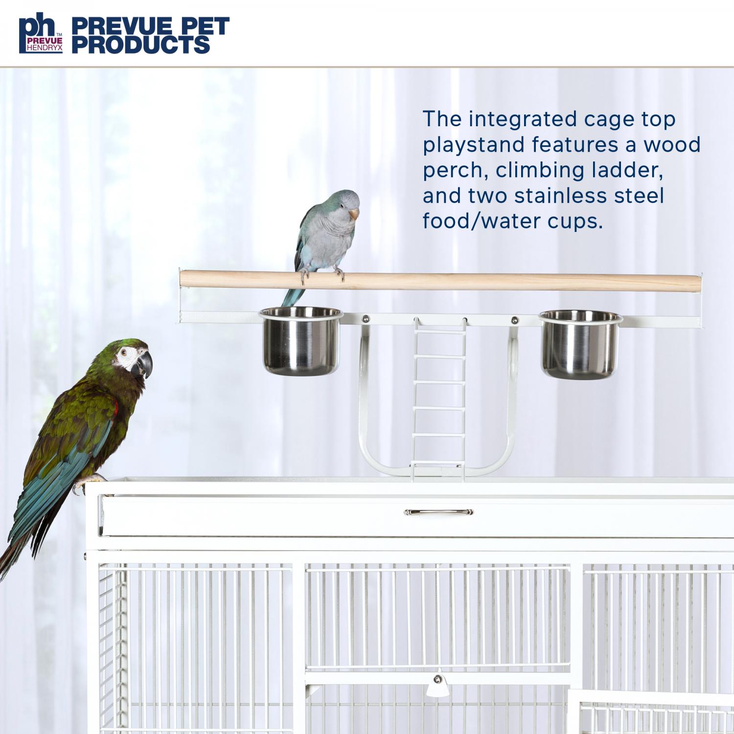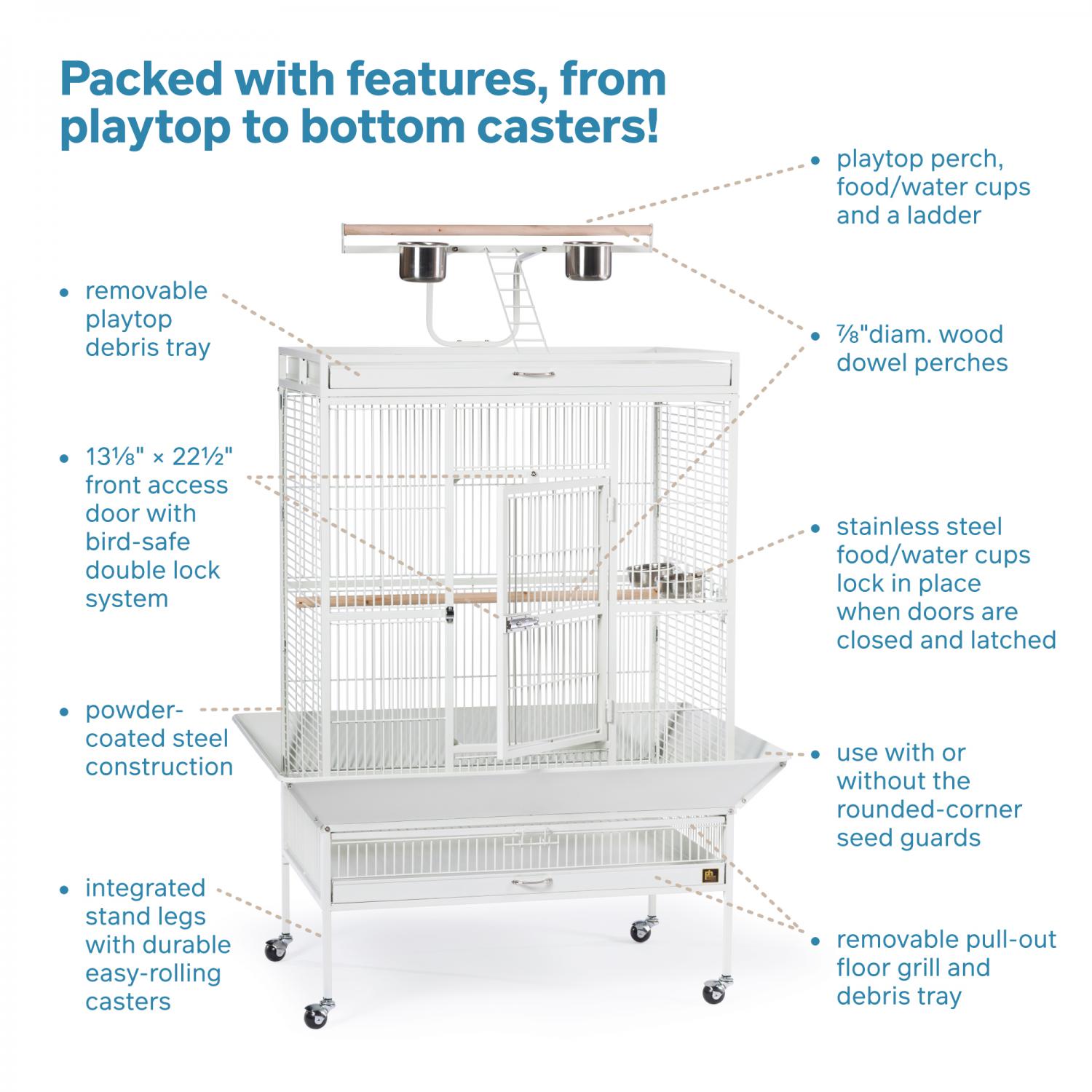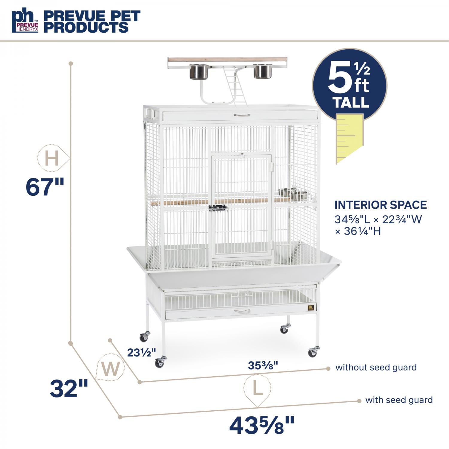 Playtop Bird Home - Chalk White (#3154C) from Prevue Pet Products features quality powder-coated steel construction at an affordable cost. A cagetop playstand keeps your bird entertained, while the heavy-duty push button lock keeps your bird securely inside its cage when playtime is over. Also includes four stainless steel cups, two wood perches, and an easy-rolling caster stand for portability. Both debris trays and the floor grille are removable for simple cleaning, and the rounded corner seed guards control mess around the cage. Dimensions: 35-3/8"L x 23-1/2"W x 67"H. Wire spacing: 3/4".