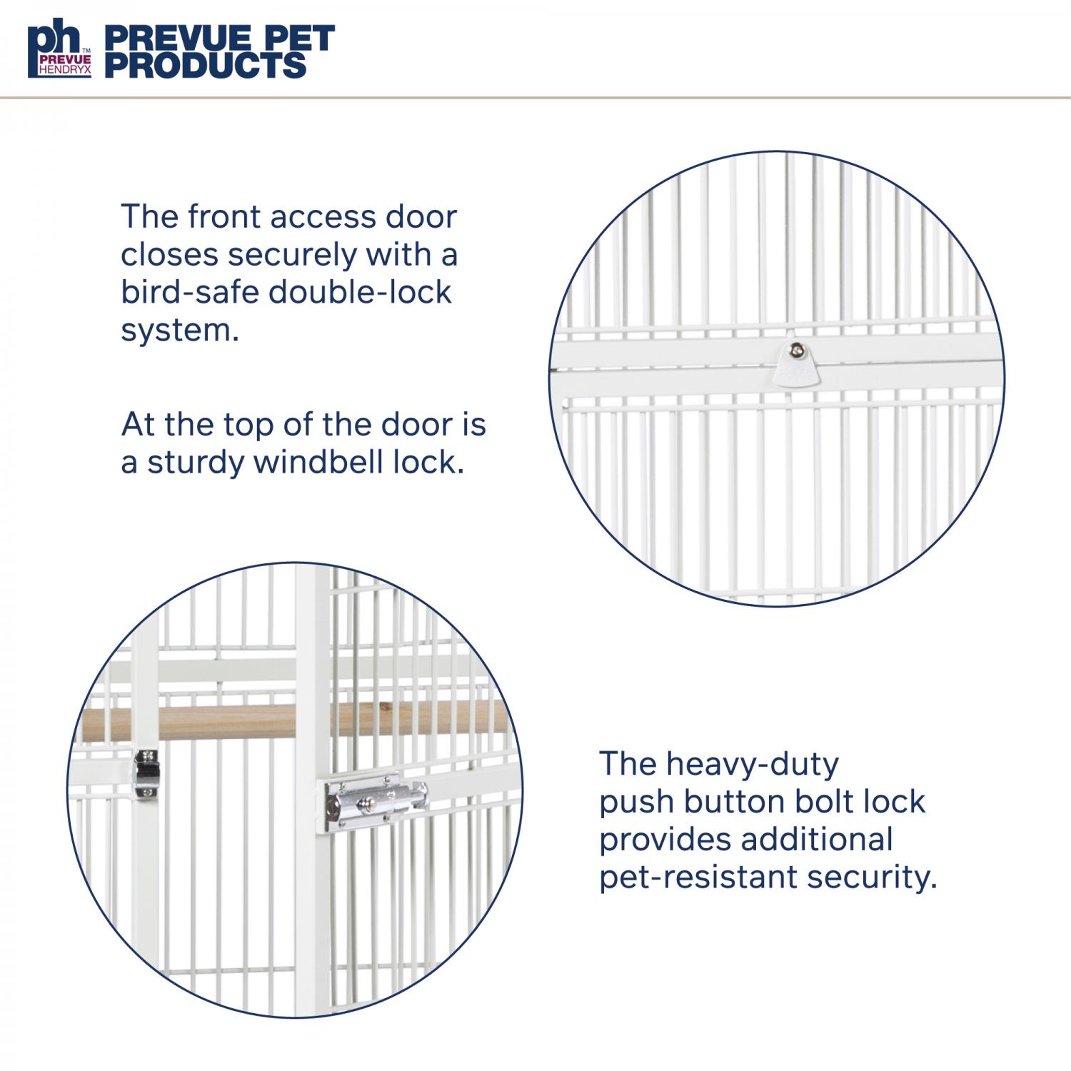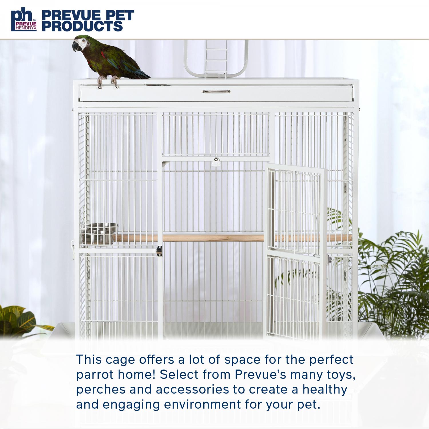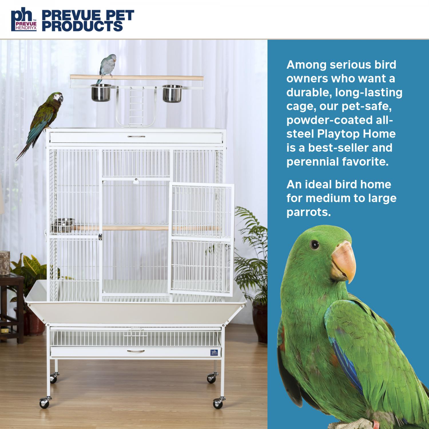 Playtop Bird Home - Chalk White (#3154C) from Prevue Pet Products features quality powder-coated steel construction at an affordable cost. A cagetop playstand keeps your bird entertained, while the heavy-duty push button lock keeps your bird securely inside its cage when playtime is over. Also includes four stainless steel cups, two wood perches, and an easy-rolling caster stand for portability. Both debris trays and the floor grille are removable for simple cleaning, and the rounded corner seed guards control mess around the cage. Dimensions: 35-3/8"L x 23-1/2"W x 67"H. Wire spacing: 3/4".