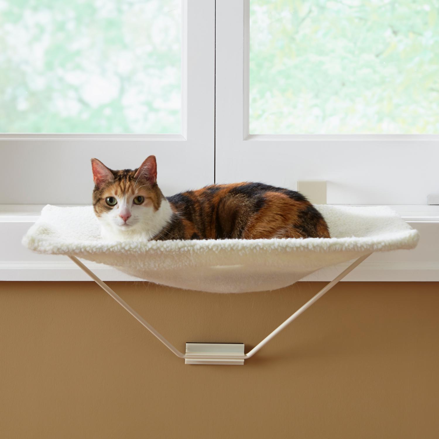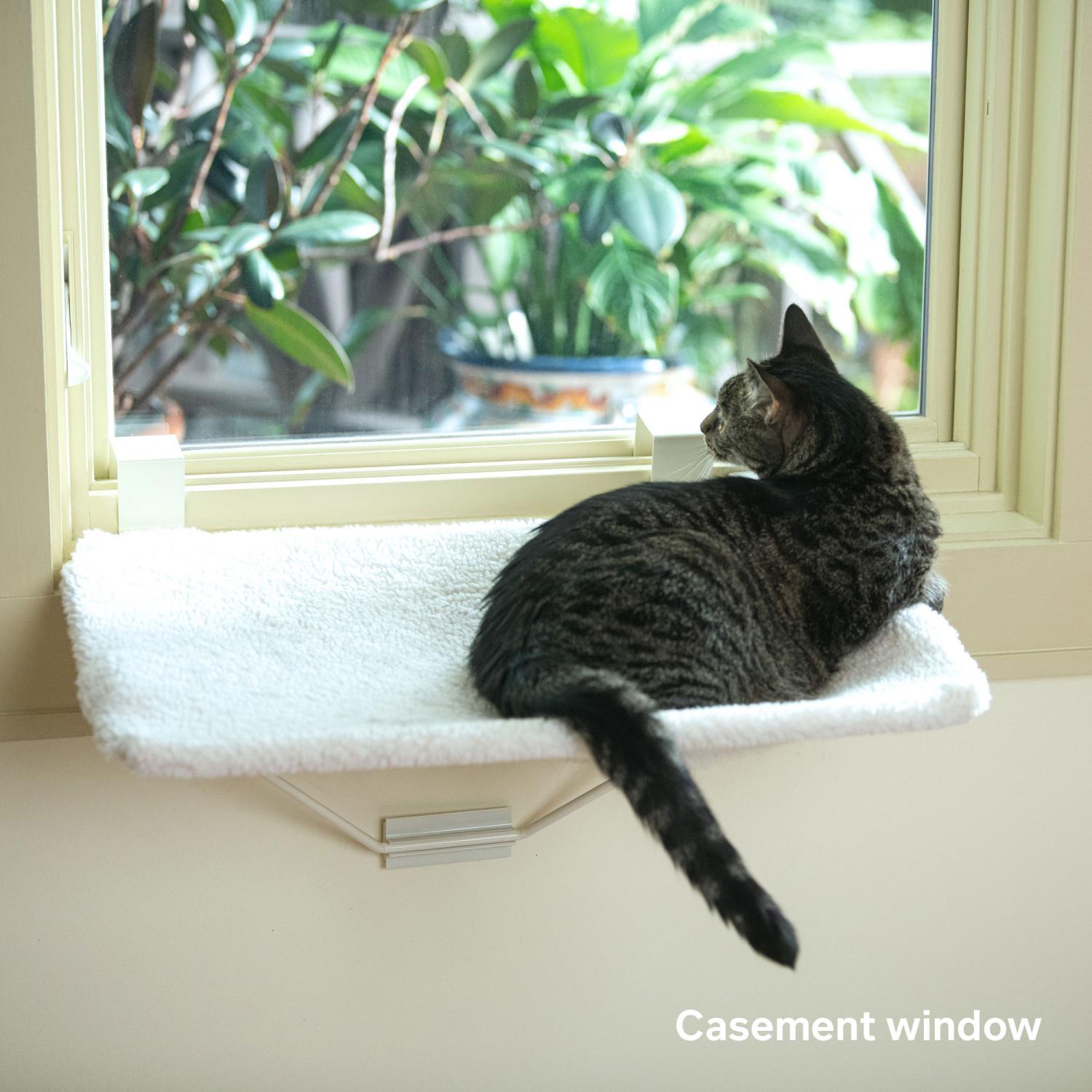TabbyNapper™ (#710) from Prevue Pet Products is the first portable window bed for cats that works on both casement (crank style) and double hung (vertical sliding) windows. The cat bed cradles cats in fleecy comfort while the Velcro strap underneath the cover adds extra support. The sturdy steel frame can hold up to 35 lbs, perfect for homes with multiple cats. The TabbyNapper is easy to assemble and install, with no tools needed, and the removable cover is machine washable. Recommended for both kittens and adult cats. Dimensions: 24"L x 14-3/4"W.